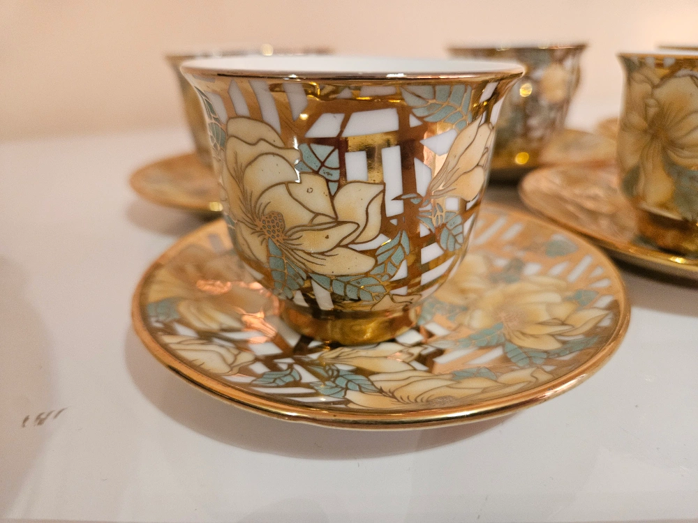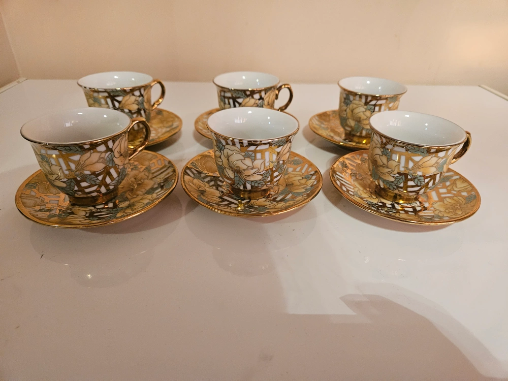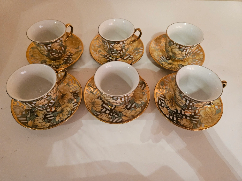Selling a beautiful set of six vintage Coffee cups and saucers. They feature a lovely floral design with gold accents. Perfect for adding a touch of elegance to your tea time!