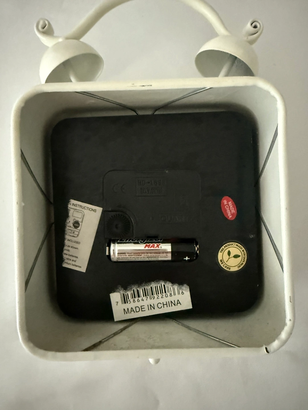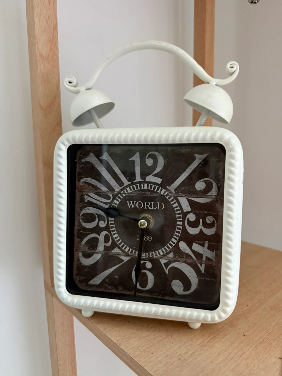 Selling a cute square alarm clock with twin bells on top! It's in great shape and would look lovely on a bedside table or shelf. The clock face has a vintage-style design with large numerals and the word "WORLD" in the center. It runs on a single AA battery.