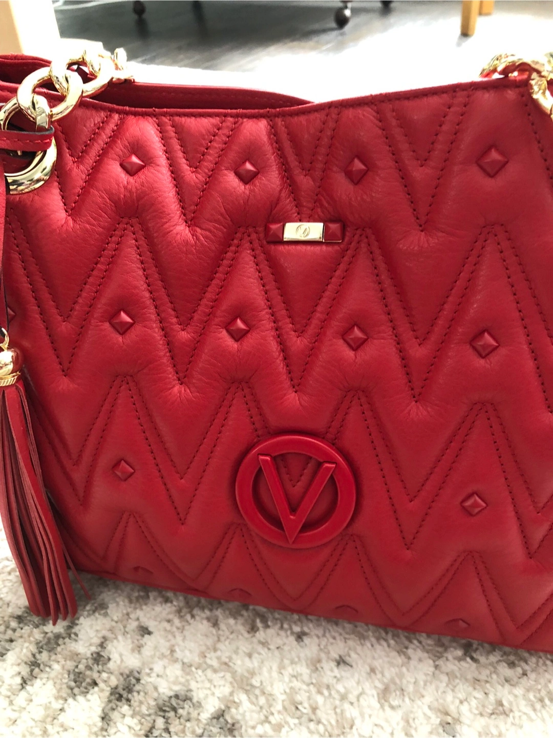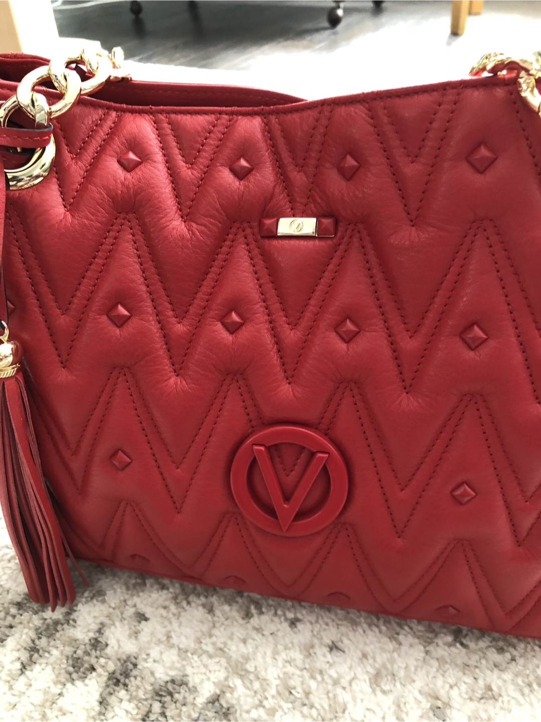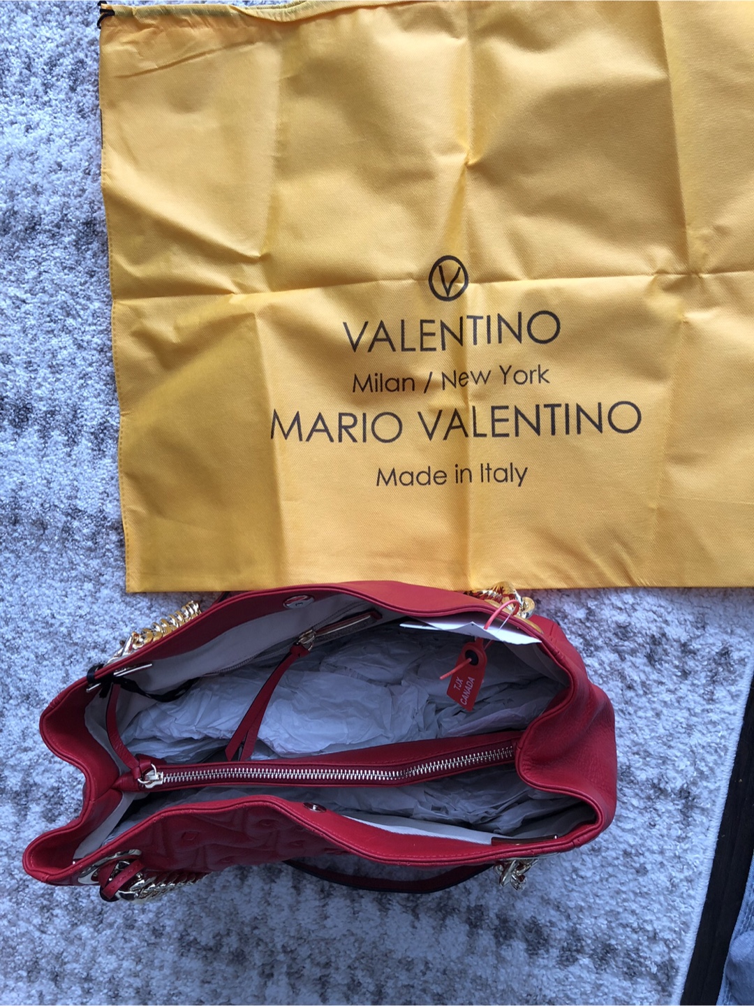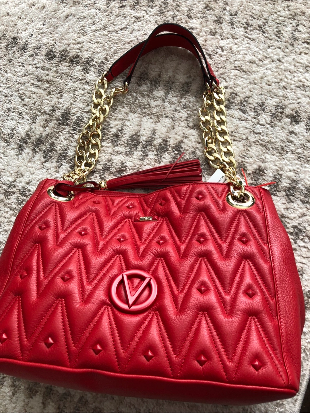 Selling a beautiful red leather shoulder bag from Valentino. It features a quilted design and gold chain straps. Perfect for adding a pop of colour to any outfit!