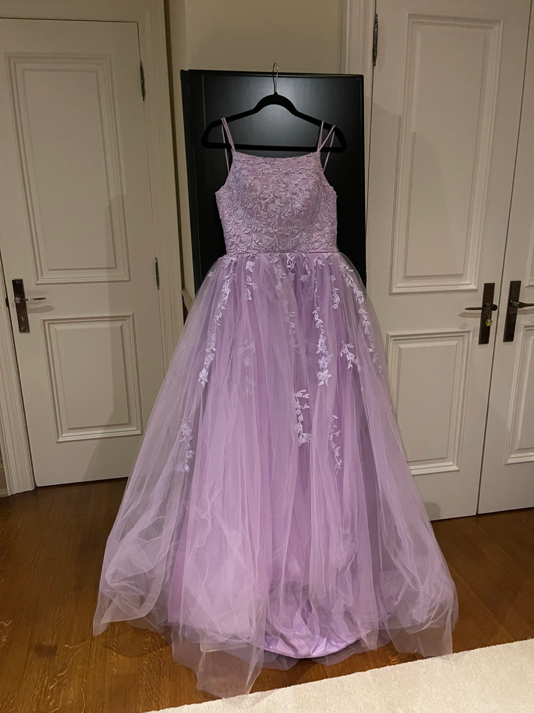 Selling a beautiful lilac formal dress! It features delicate floral lace detailing and a flattering silhouette. Perfect for prom or any special occasion! It has been worn once.