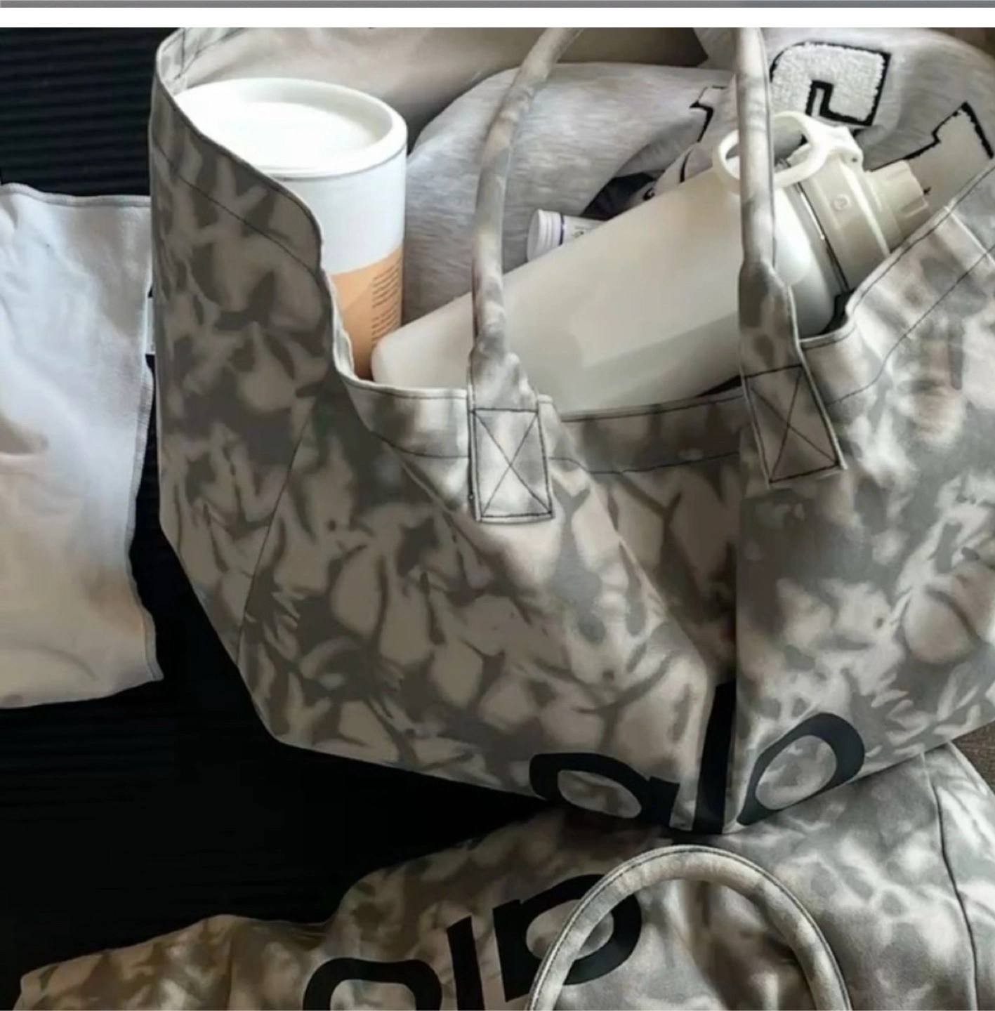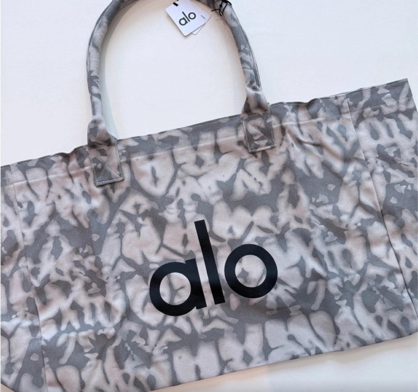 Stylish ALO Yoga tote bag. Features a gray and white pattern. Perfect for everyday use, travel etc