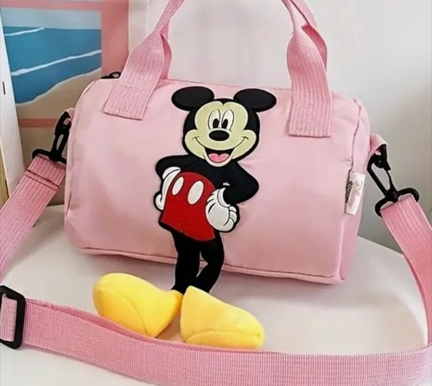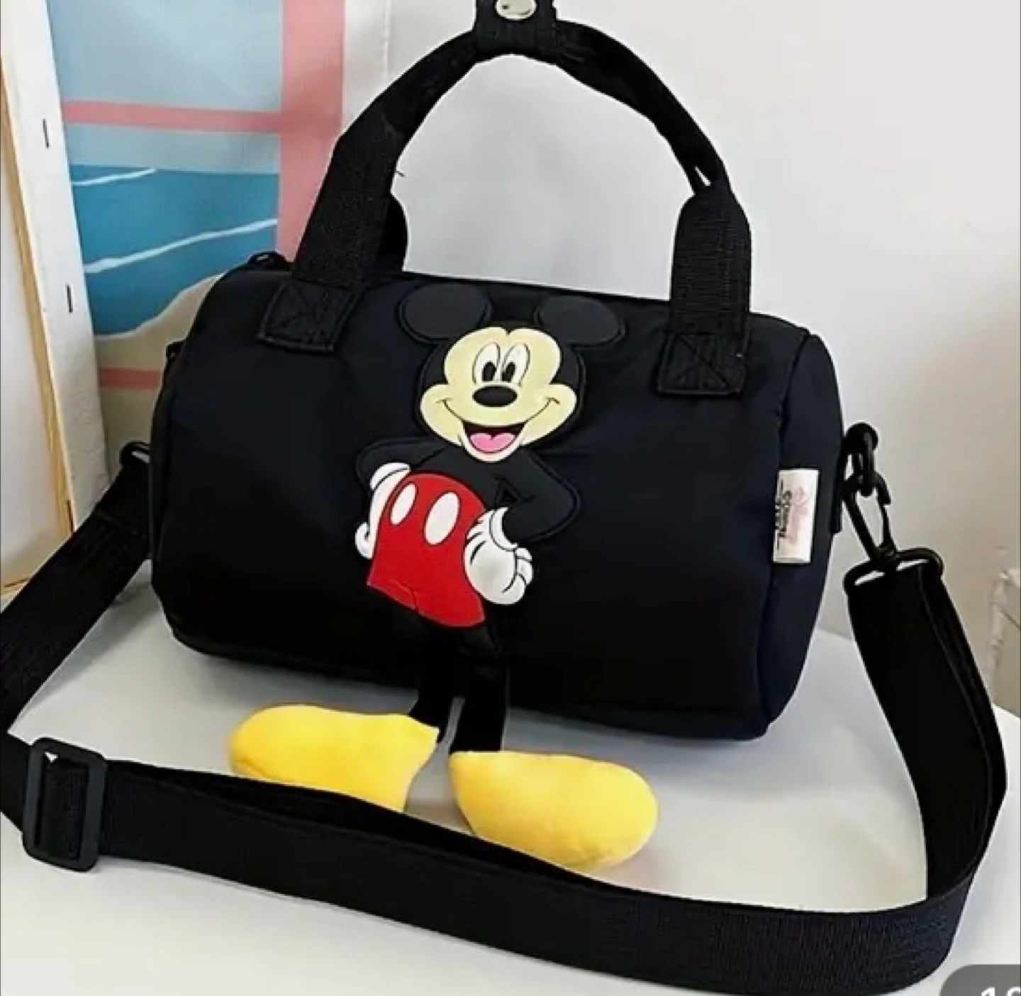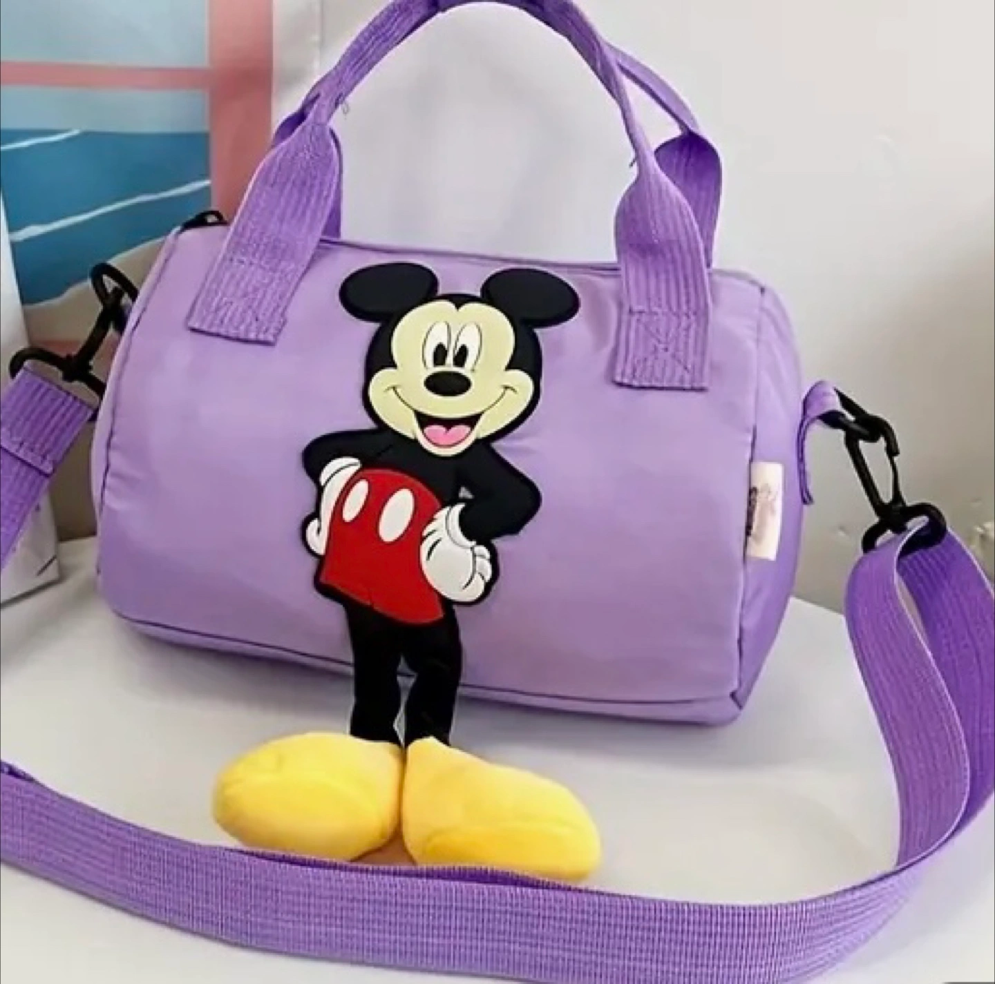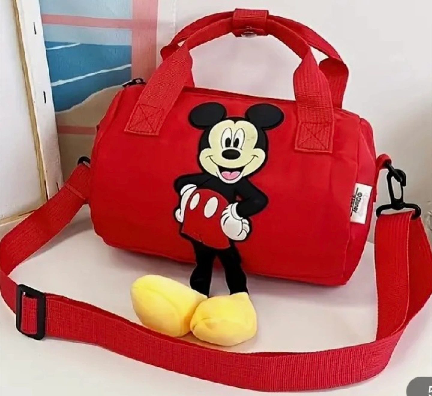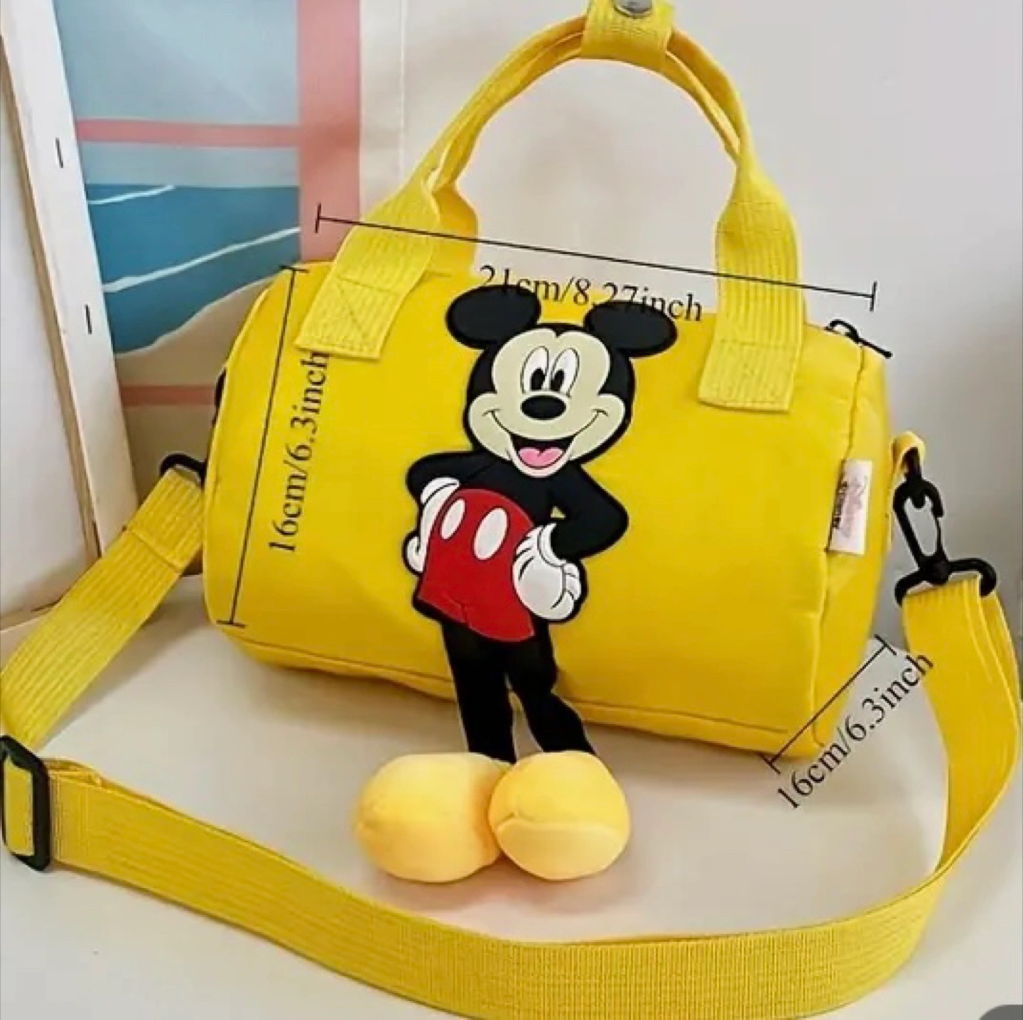 Super cute Mickey Mouse barrel bag! It's perfect for kids or anyone who loves Disney. The bag features a fun Mickey Mouse design and comes in different colors. It's a great size for carrying essentials, and the adjustable strap makes it easy to wear. Dimensions are approximately 8.27 inches in length and 6.3 inches in height