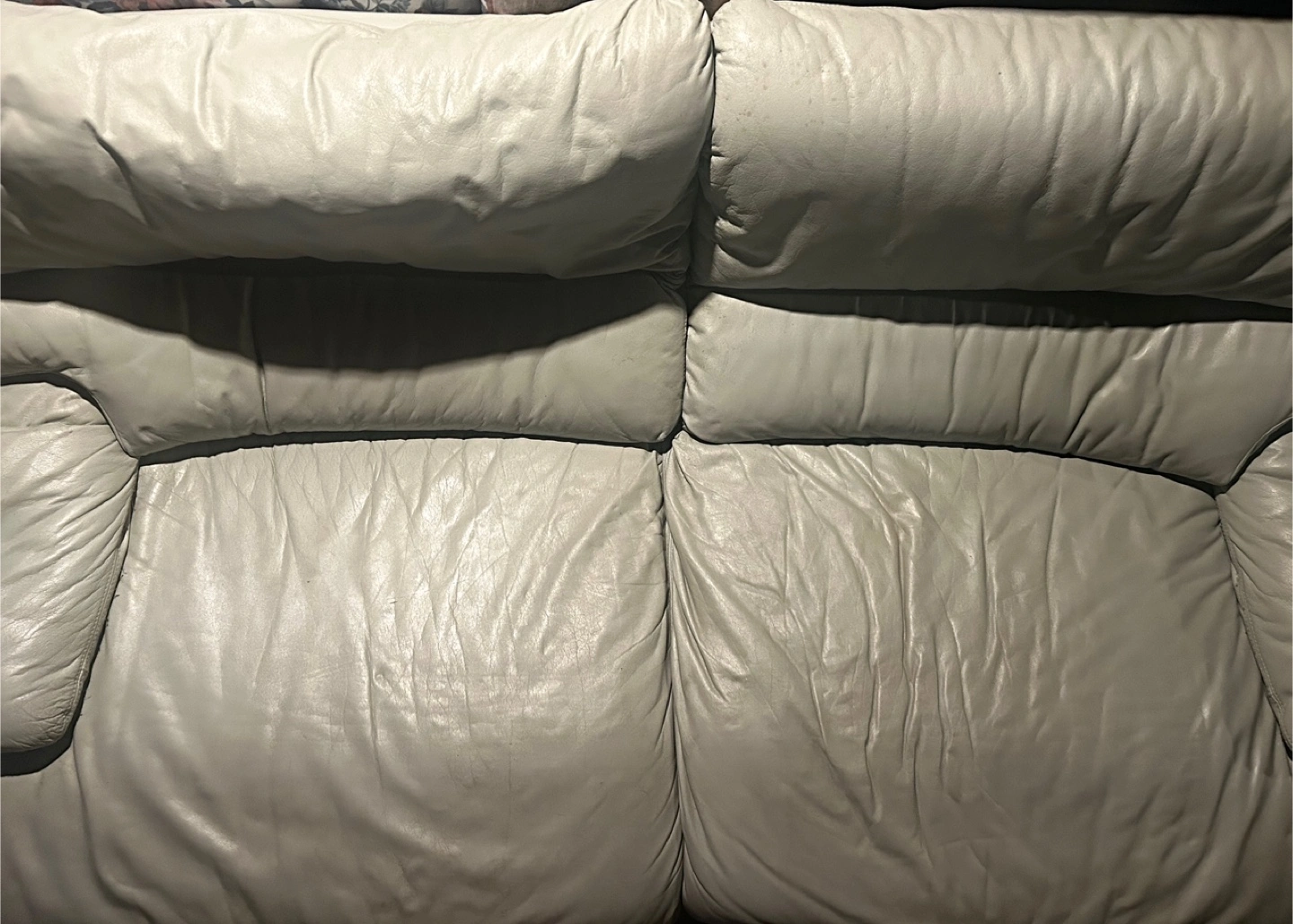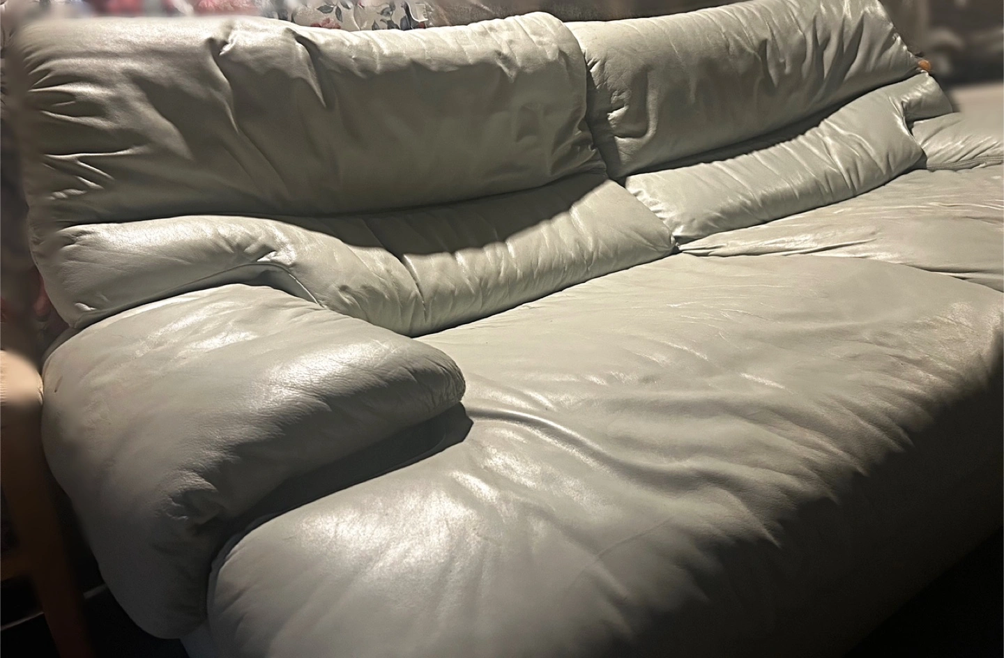 Selling a comfy leather sofa in a light grey colour. It's gently used and ready for a new home! Perfect for a living room or den.