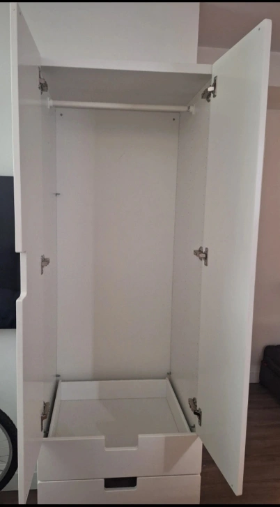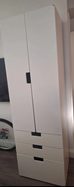 Selling a white IKEA Småstad wardrobe. It's in great condition and perfect for a kid's room or any space needing extra storage. It features a hanging rod and three drawers for organization. It's a practical and stylish piece!