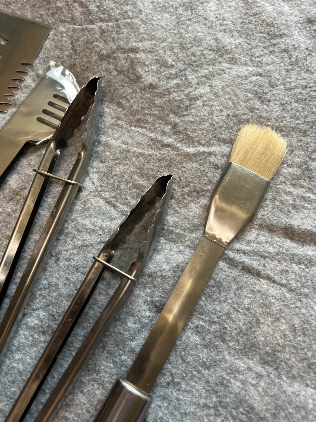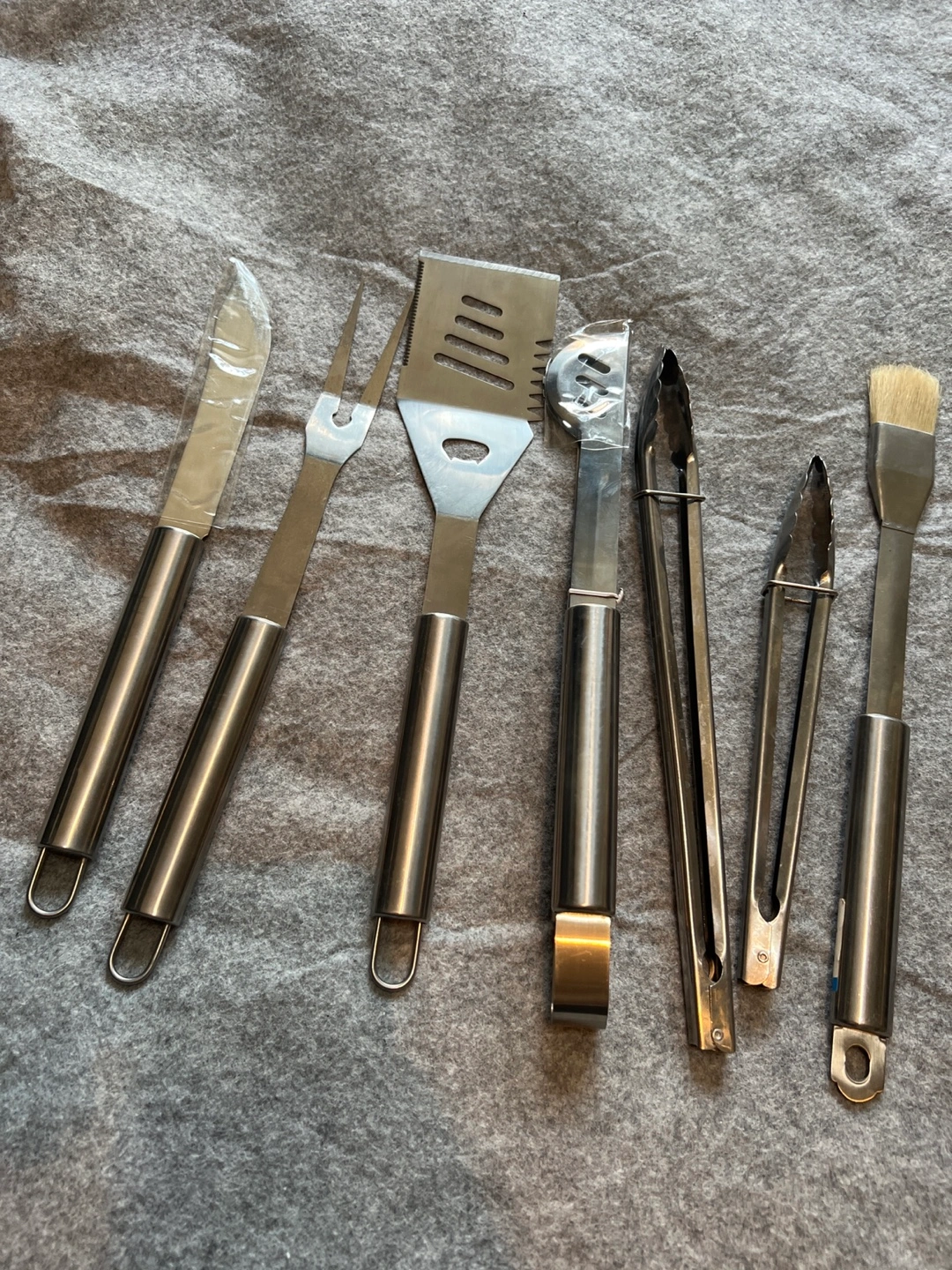BRAND NEW HEAVYWEIGHT HEAVYDUTY. Selling a BBQ grill tool set. Includes a spatula, tongs, basting brush, and more. All made of stainless steel and in good condition. Perfect for your summer grilling! Added free Red Salad tongs.
