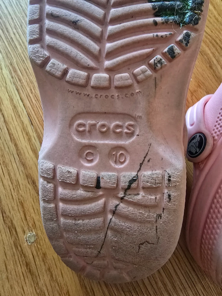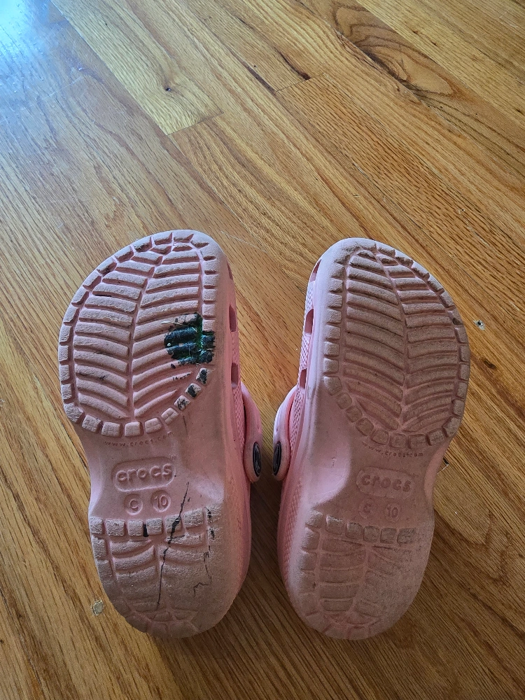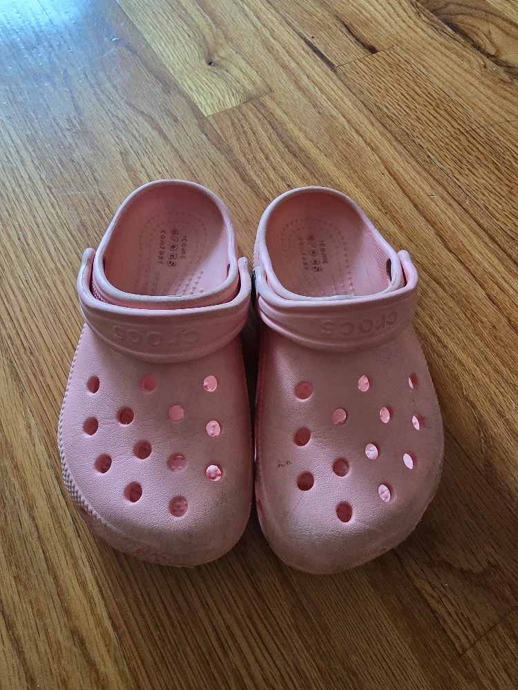 150Selling a pair of pink Crocs clogs in size C10. They show some signs of wear, but still have lots of life left!