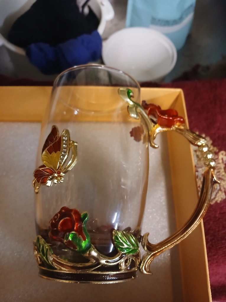 Selling a beautiful luxury glass mug, complete with its original box! It features a lovely rose handle and butterfly design. This mug is sure to add a touch of elegance to your tea or coffee time