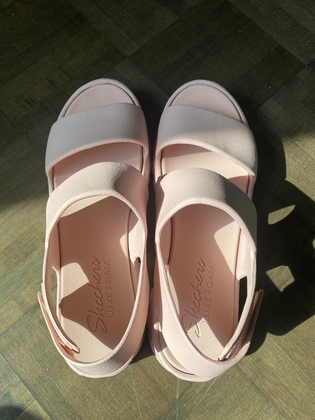 979Skechers Luxe Foam sandals. Size 10. Light pink. Water resistant. They're super comfy and perfect for everyday wear. The luxe foam provides great cushioning for your feet!