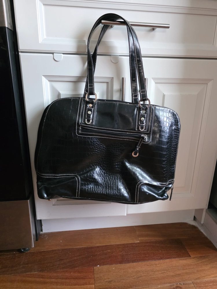 Giving away a black bag. It has a crocodile-like pattern and a zipper on the top. The inside is black, and it has a laptop sleeve in it and several zippered compartments. This was my first professional bag. There are a few minor defects on the bottom but they are not noticeable, unless you're looking closely.