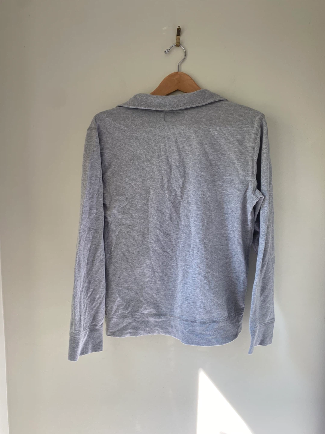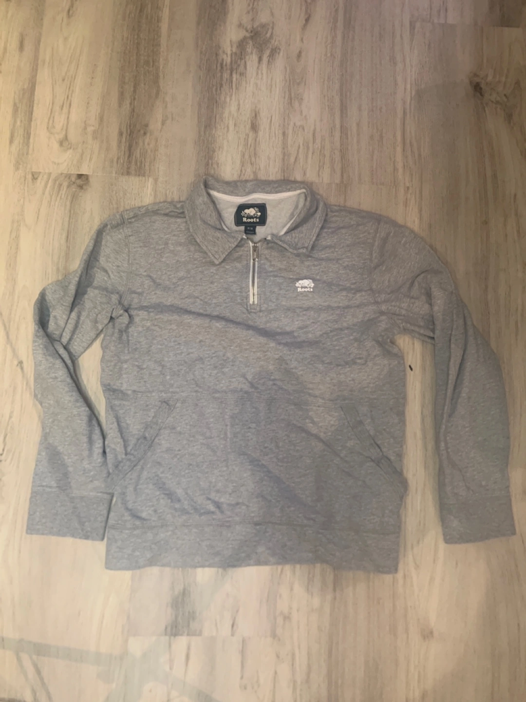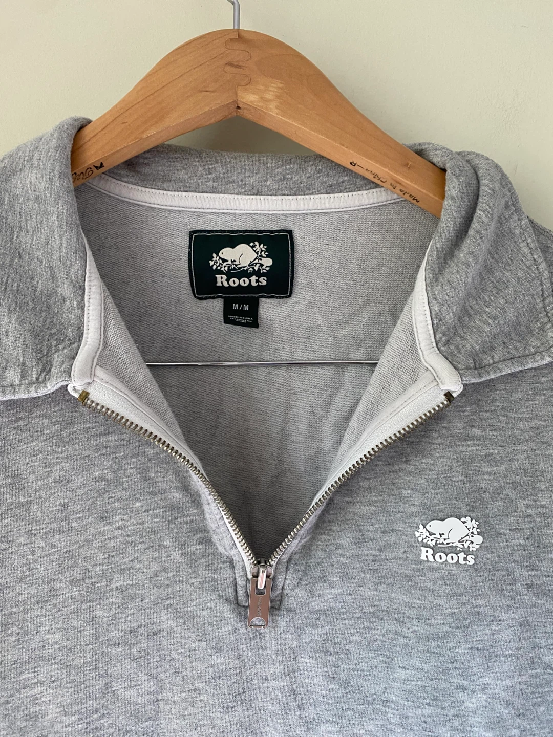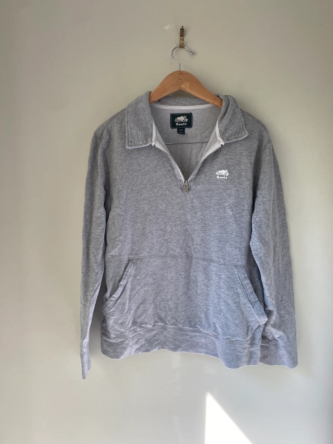Cozy Roots sweatshirt in a light grey colour. It's a size medium and features a convenient half-zip design.