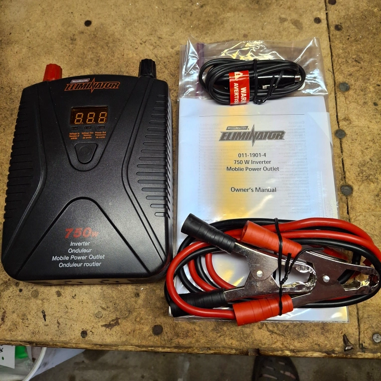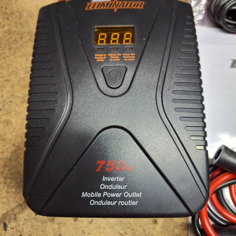 Selling (new never used). Eliminator 750W Inverter Mobile Power Outlet. It comes with the owner's manual and all the cables you need to get started, battery adaptor and 12 volt cigarette adaptor. Great for dry camping if you need house plug for coffee machine, lamp or charging port.