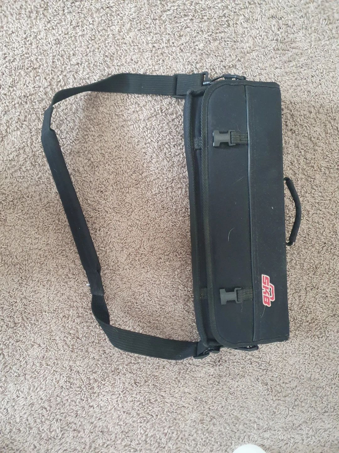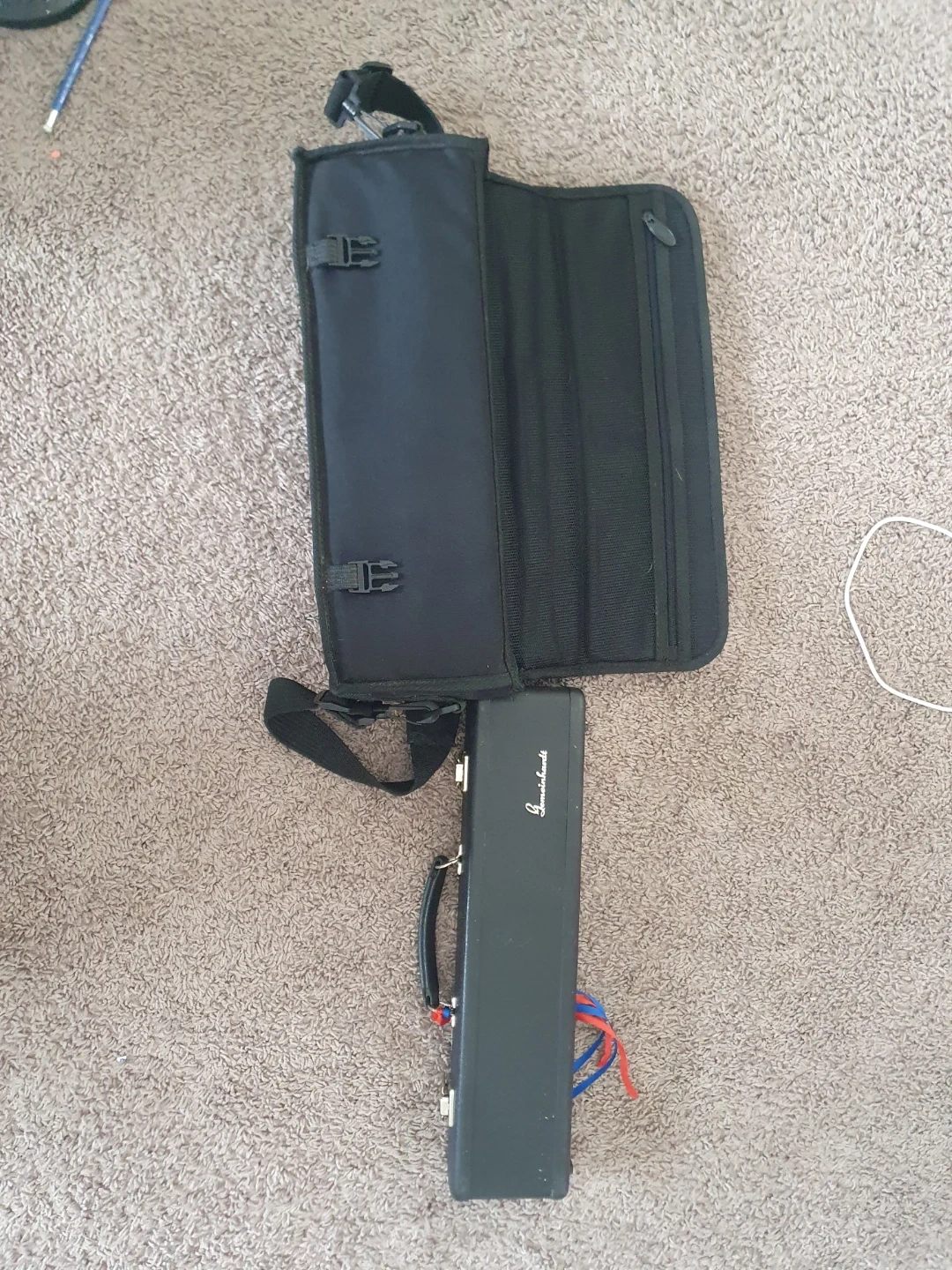 Silver-tone flute in a blue velvet-lined hard case. Perfect for beginners or as a practice instrument! It is a bit used and with black case to walk with it.