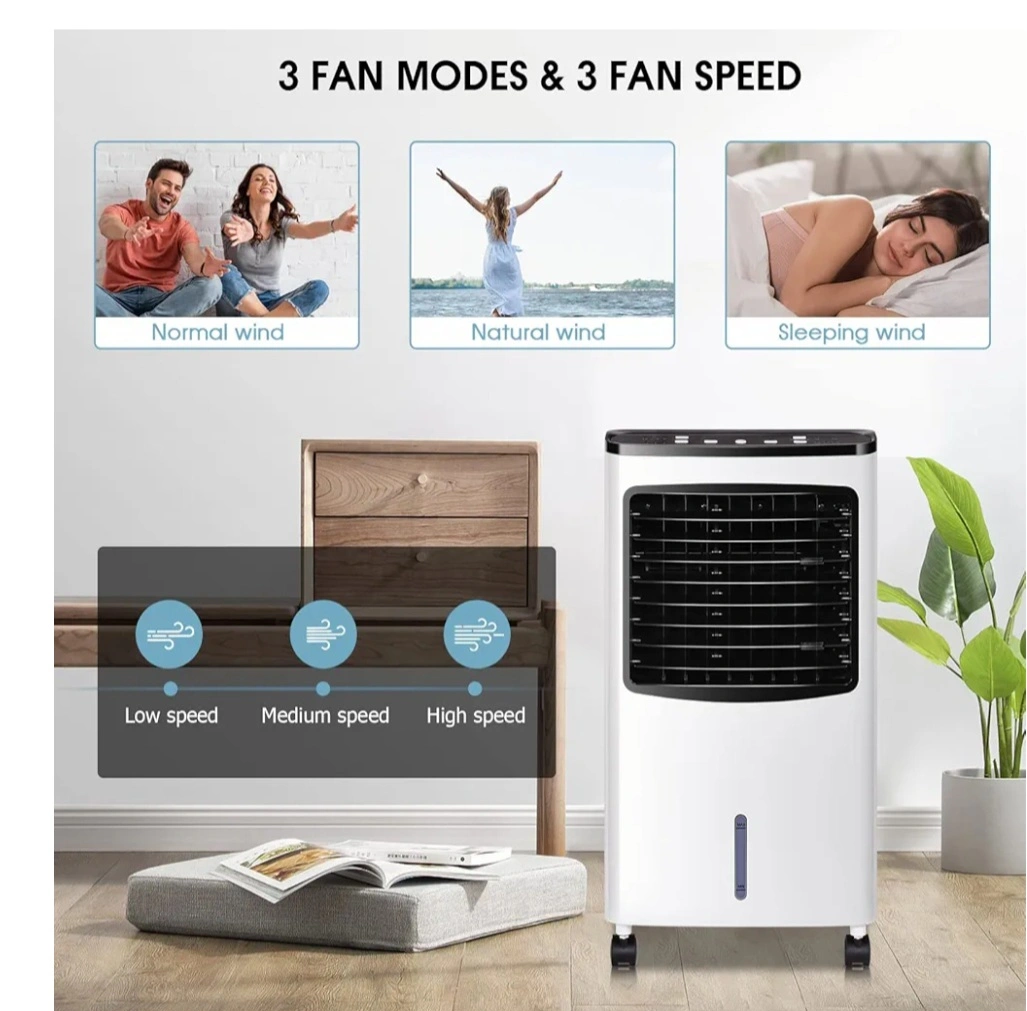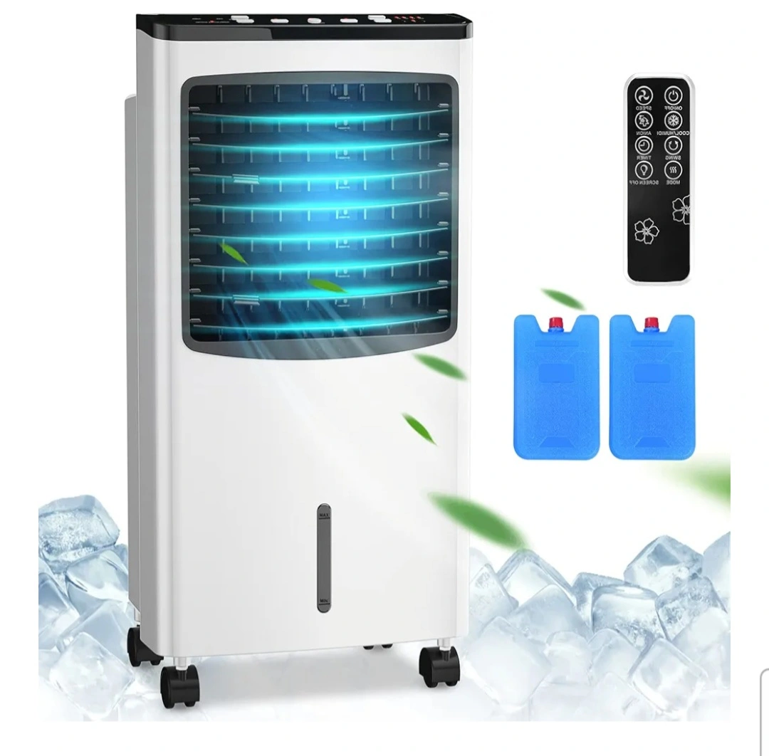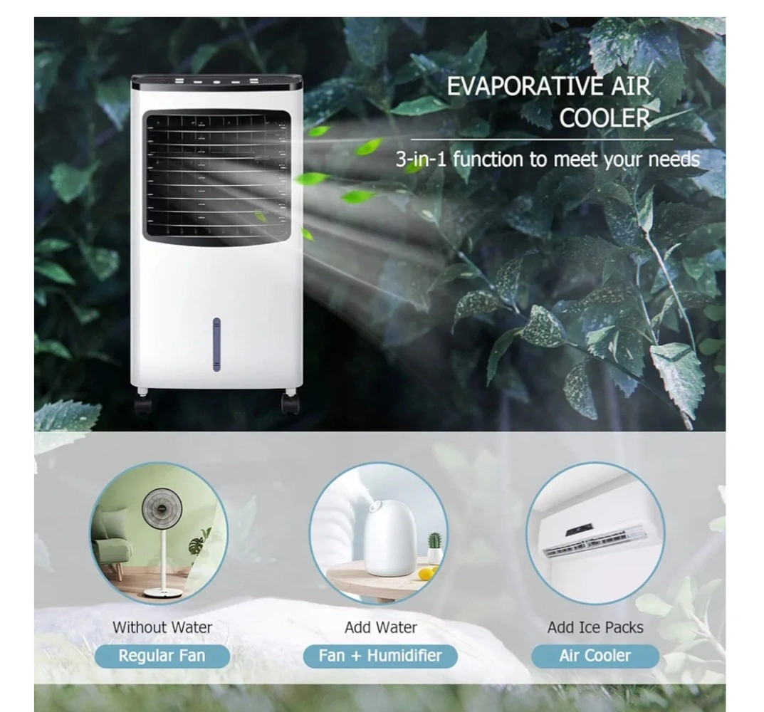 Keep cool this summer with this evaporative air cooler! It has a 3-in-1 function to meet your needs: regular fan, fan + humidifier, and air cooler (when you add ice packs). Key features: - 3 fan modes & 3 fan speeds - Wide-angle oscillation - Remote control is missing - Water tank capacity: 8L