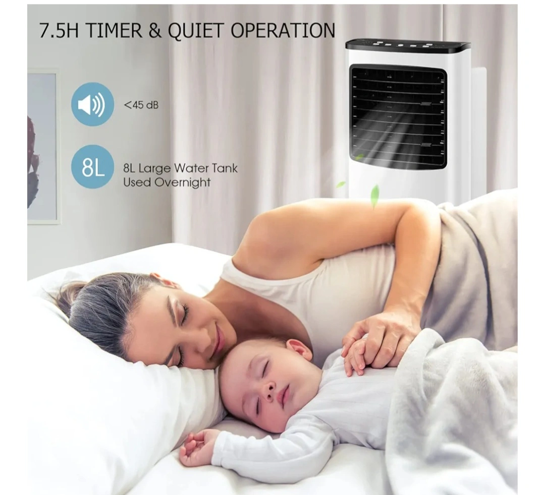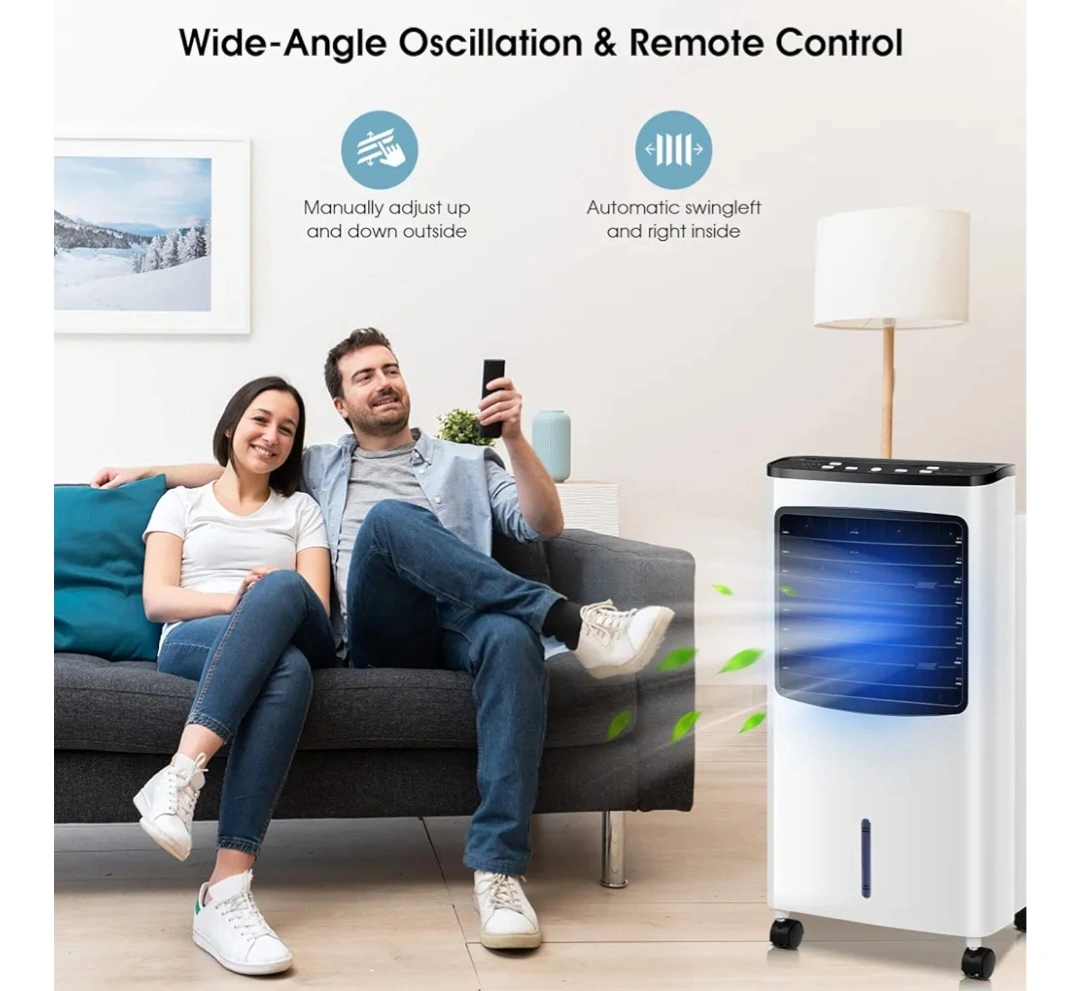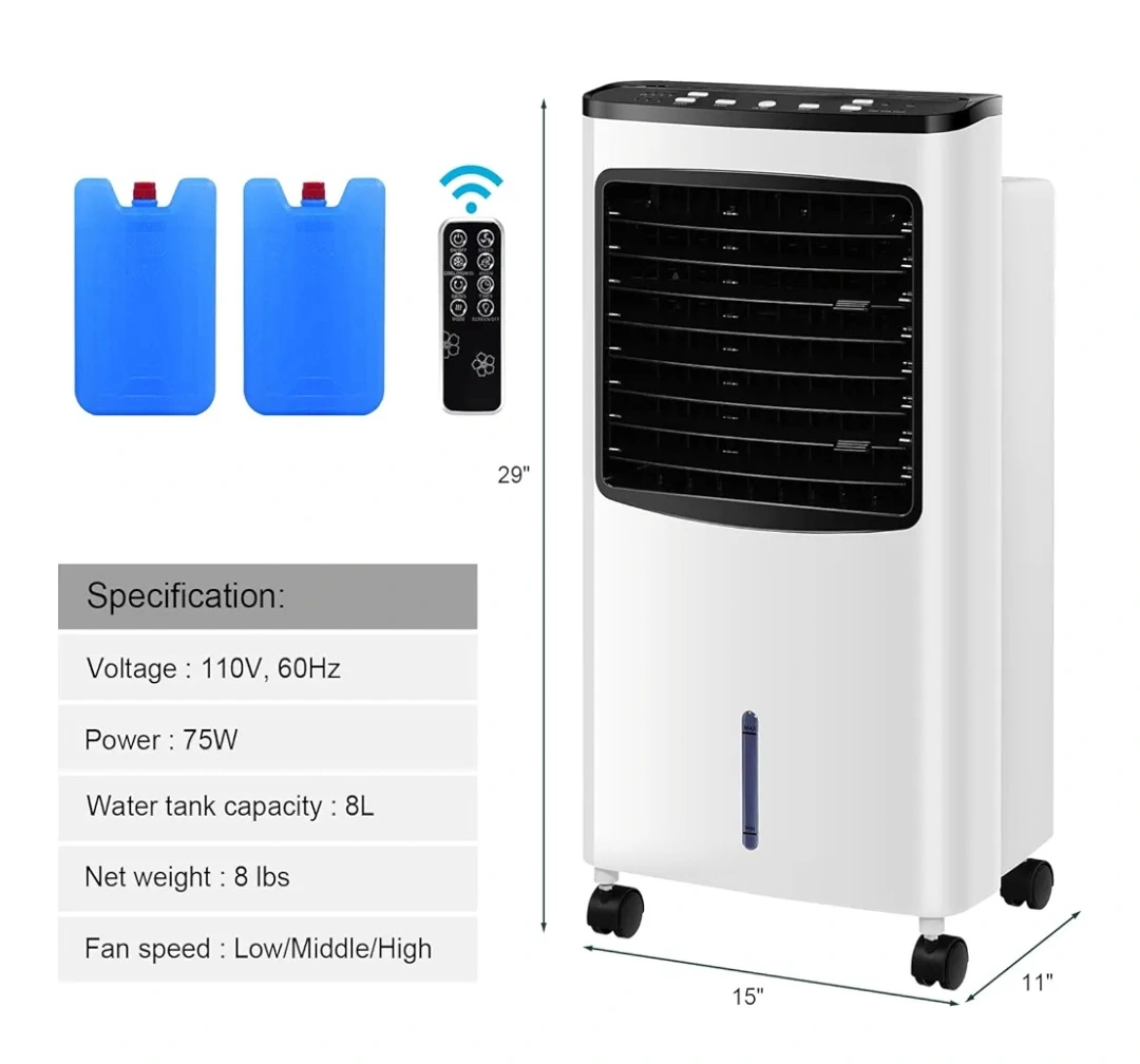 Keep cool this summer with this evaporative air cooler! It has a 3-in-1 function to meet your needs: regular fan, fan + humidifier, and air cooler (when you add ice packs). Key features: - 3 fan modes & 3 fan speeds - Wide-angle oscillation - Remote control is missing - Water tank capacity: 8L