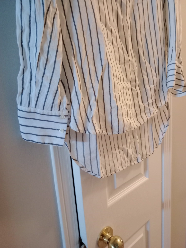 Add a touch of chic sophistication to your wardrobe with this Zara Woman striped blouse. Featuring a stylish collar and button-down design, this blouse is perfect for both casual and professional settings. It is in great condition and ready for a new home.