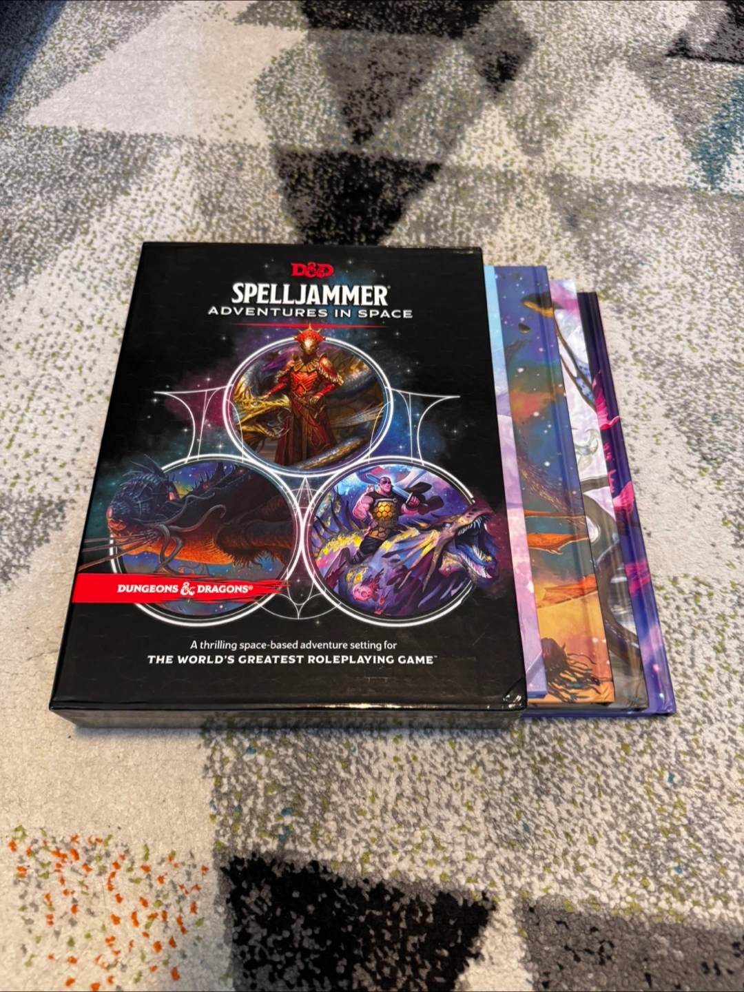Dungeons & Dragons (D&D DnD) Spelljammer boxed set. Travel the stars between fantasy worlds by flying on magical spaceships. Includes all three books and DMs screen. Minor cosmetic damage on box and spine of one book (see picture).