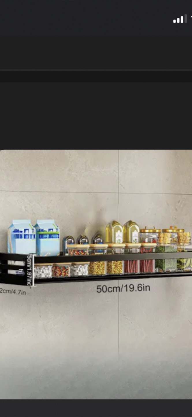 Selling a black metal kitchen shelf. It's about 50cm or 10 inches long and would be great for organizing your spices or other kitchen items. It's in good condition and ready for a new home!