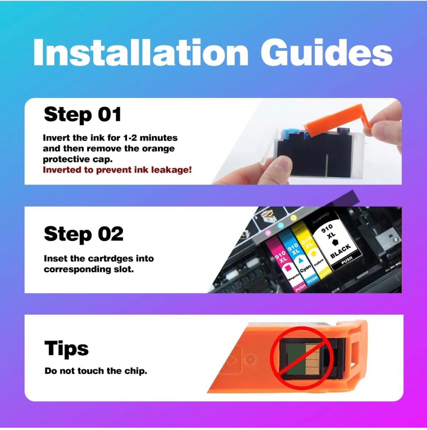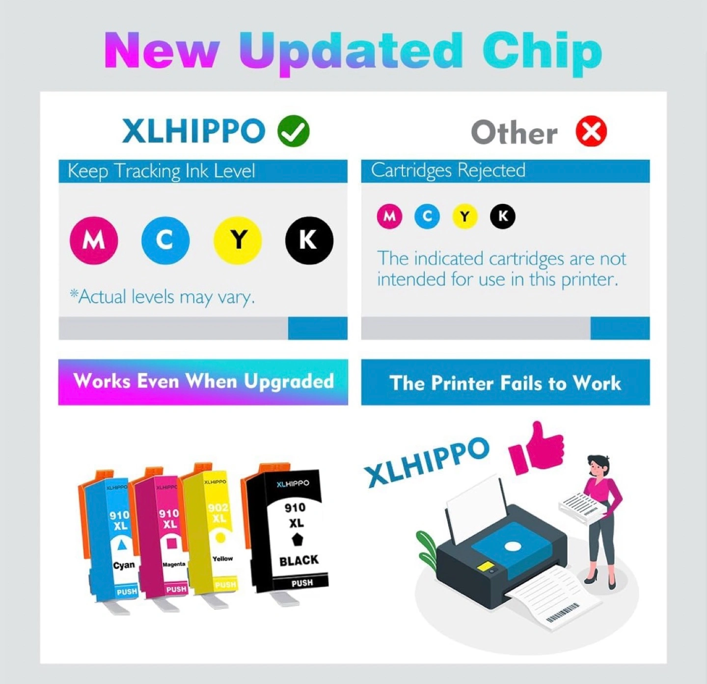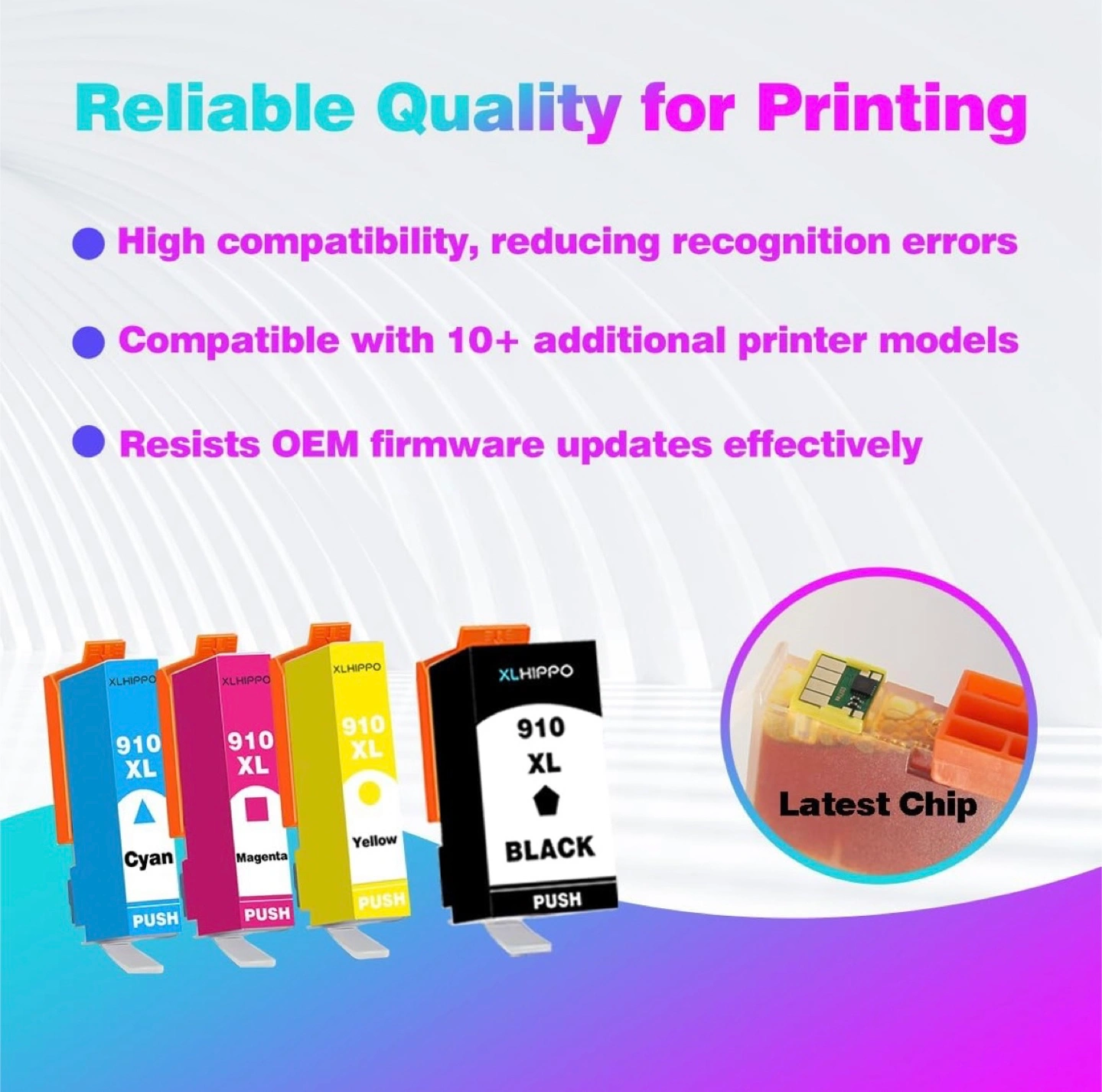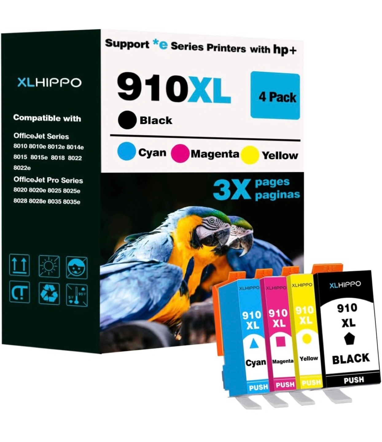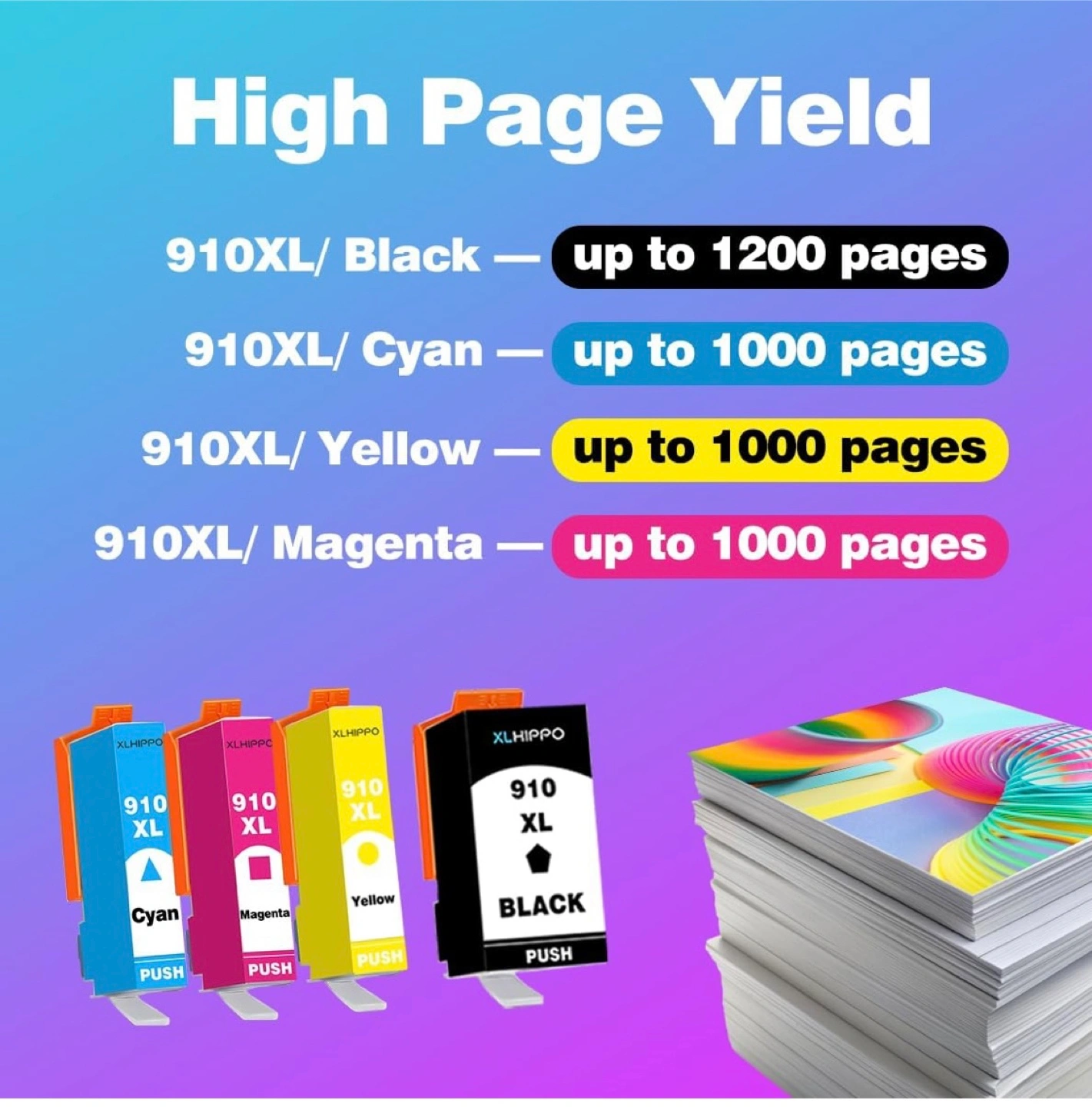 Selling a XLHIPPO 910XL ink cartridge 4-pack! This is compatible with OfficeJet and OfficeJet Pro series printers. It includes black, cyan, magenta, and yellow cartridges. The cartridges have a high page yield, with up to 1200 pages for black and up to 1000 pages for each color. Retails for $69.99