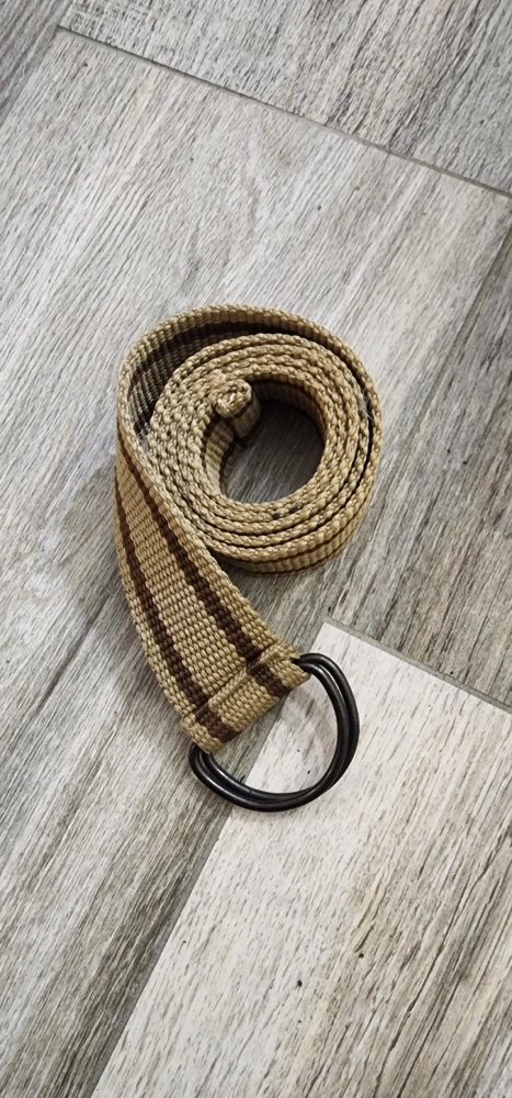 Selling a woven belt with a tan and brown striped pattern and a black D-ring buckle. It's in great condition and would be a stylish addition to any outfit!