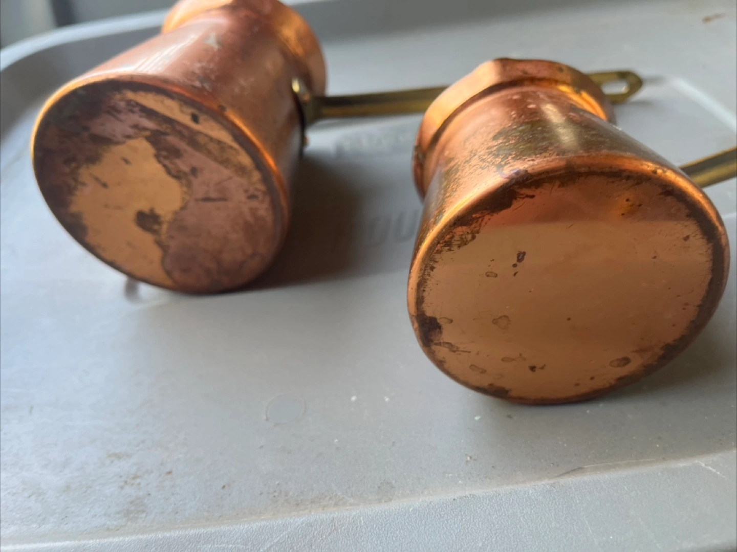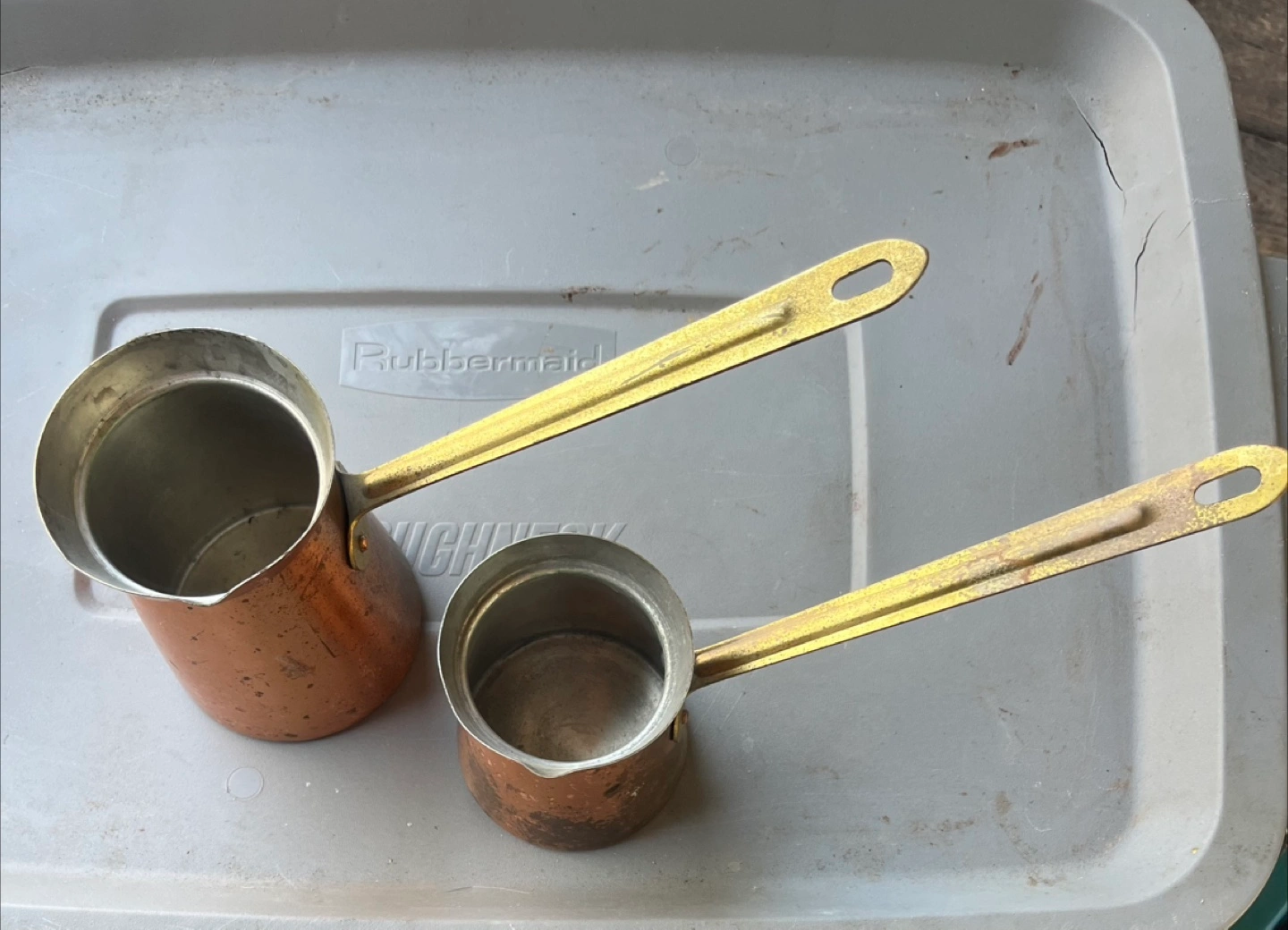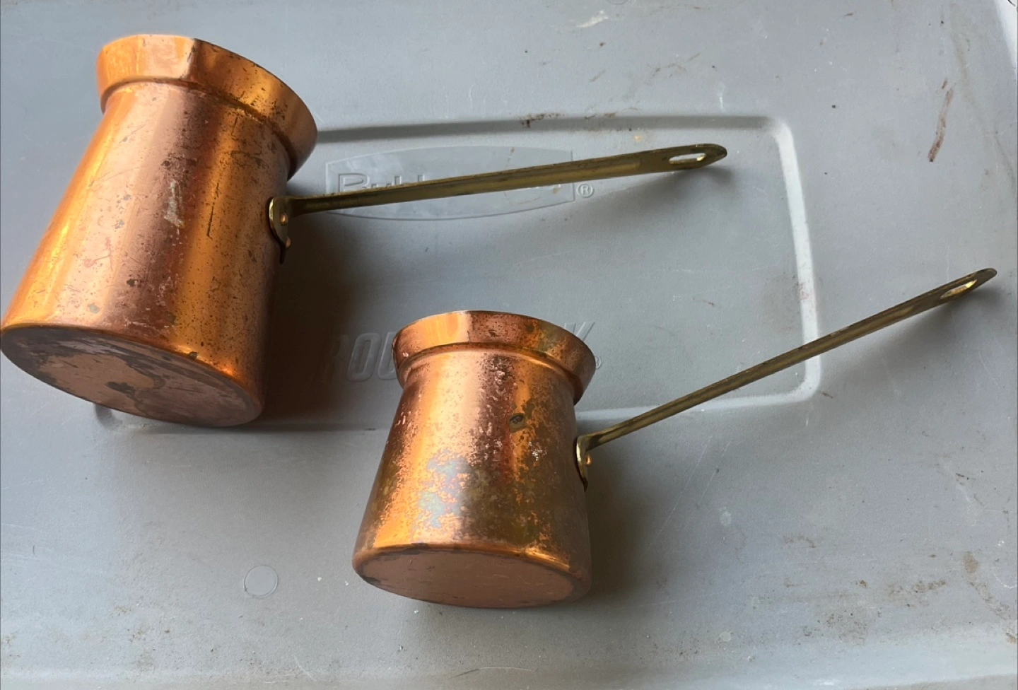 58Selling two copper Turkish coffee pots. They show some signs of use, as seen in the photos, but are still in good condition for brewing up a delicious cup of Turkish coffee
