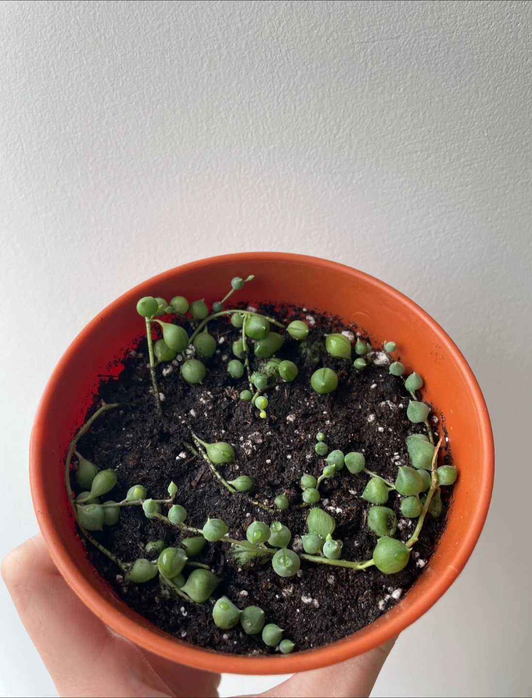 String of pearls cuttings. I can give you one of the well rooted ones in soil or a fresh cutting. The rooted one will be one of the strands in the soil there For fresh cuttings, simply lay it on top of soil to propagate or remove the pearls at the bottom and stick the nodes in water to root. Mature plant is a trailing plant that needs infrequent watering and bright light