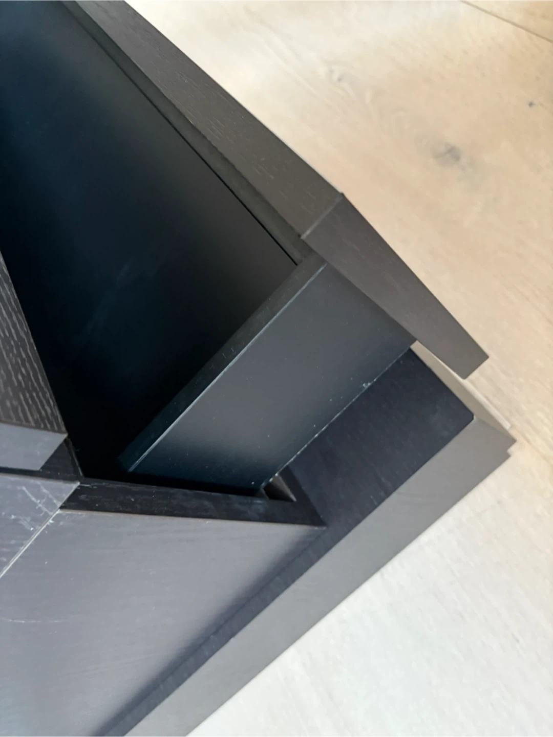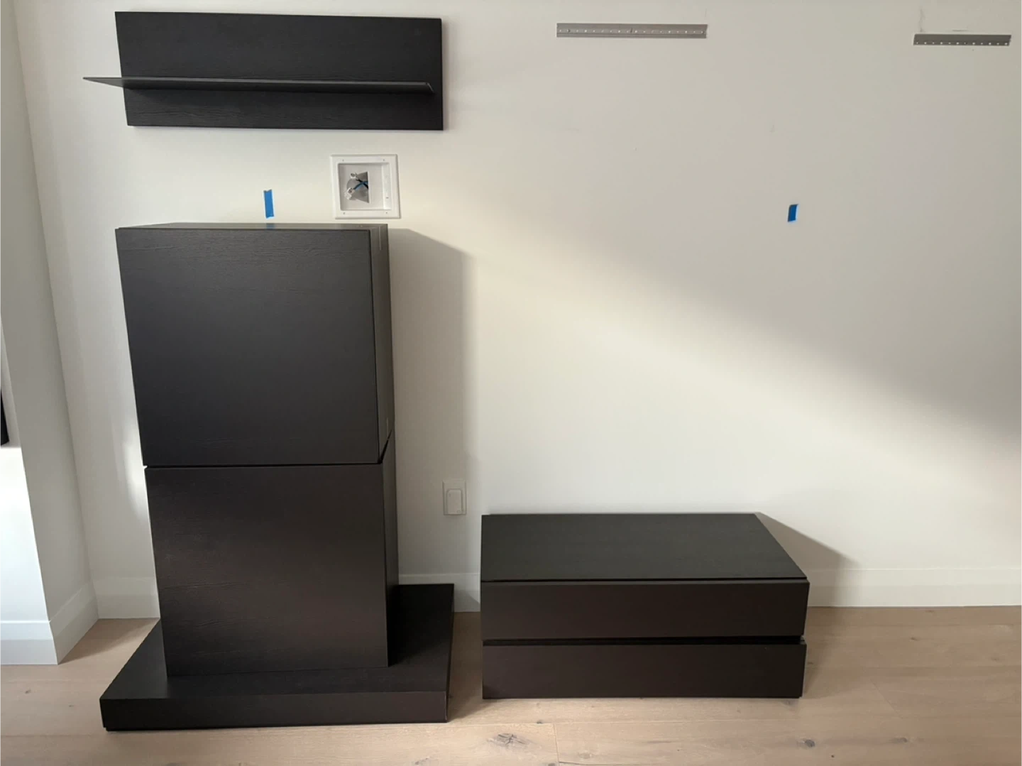 Natuzzi contemporary entertainment unit * Can be configured in different style combinations * 1 Floating shelves (2 pieces, each overall 12” x 36.5”) * 2 Cupboard units, can be hung or not (16” x 24” x 24”) * 1 base unit (no storage L 36.5” x H 4.5” x D23.5”) * 2 drawer units (one drawer is misaligned, needs repair) D18.5” x L 36.5” x H7.5”) * Purchased from Hauser Burlington Pickup area: West Mountain Hamilton