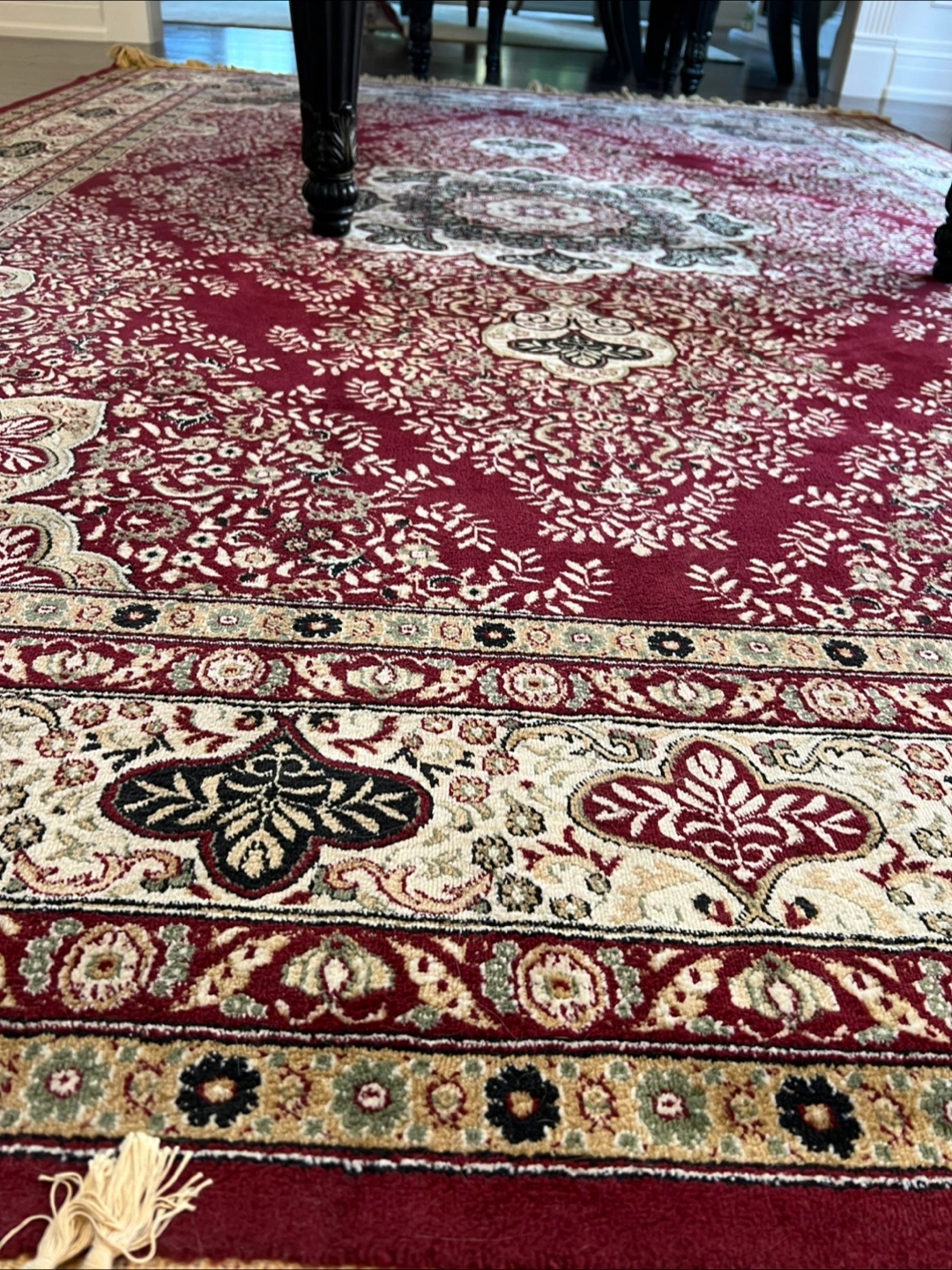 Selling a beautiful red area rug with an intricate pattern. It would look great in a living room or dining room