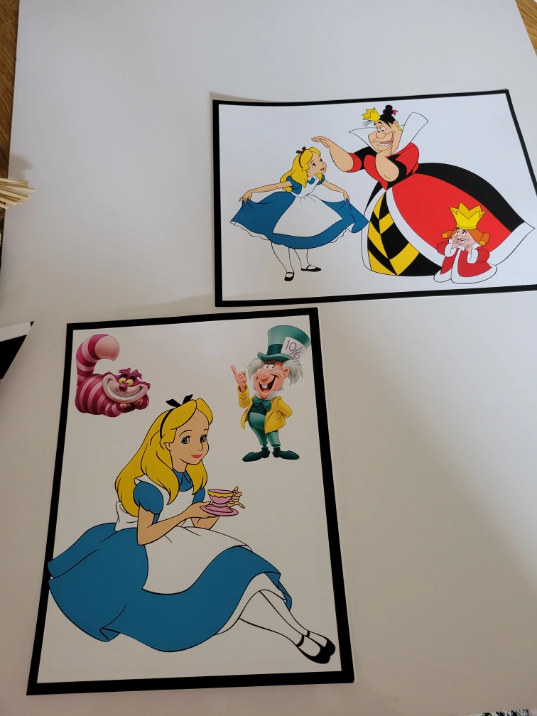 Selling Alice in Wonderland-themed homemade prints. It's got Alice, the Cheshire Cat, the Mad Hatter's Queen of Hearts, and King, iconic imagery from the story. Great for any Disney or Alice in Wonderland fan.