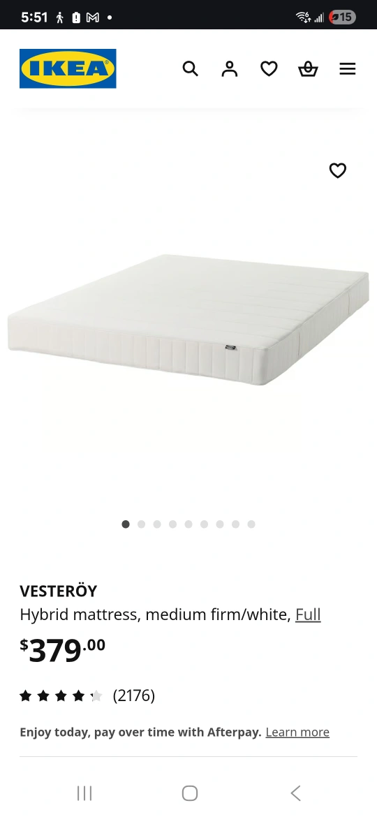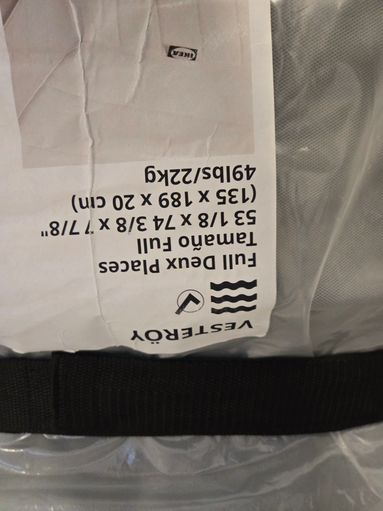 80Selling an IKEA VESTERÖY hybrid mattress in full size. It's medium-firm and comes in white. Dimensions are 53 1/8 x 74 3/8 x 7 7/8 inches (135 x 189 x 20 cm). Originally bought for $379.00 New never used