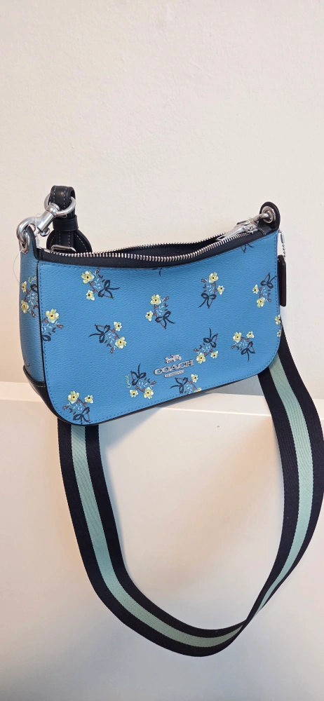 Here's a cute Coach shoulder bag featuring a floral print! It has a zipper closure and an adjustable strap.