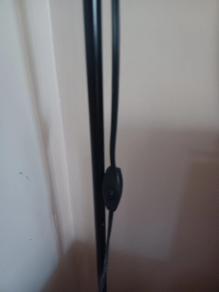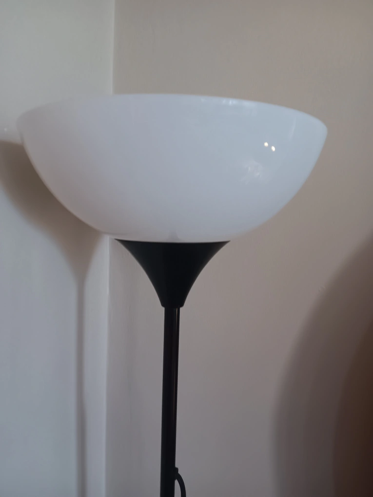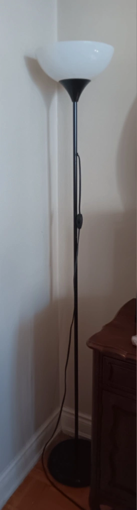 Here's a simple floor lamp with a black stem and a white shade. It's in great condition and ready to brighten up any room.