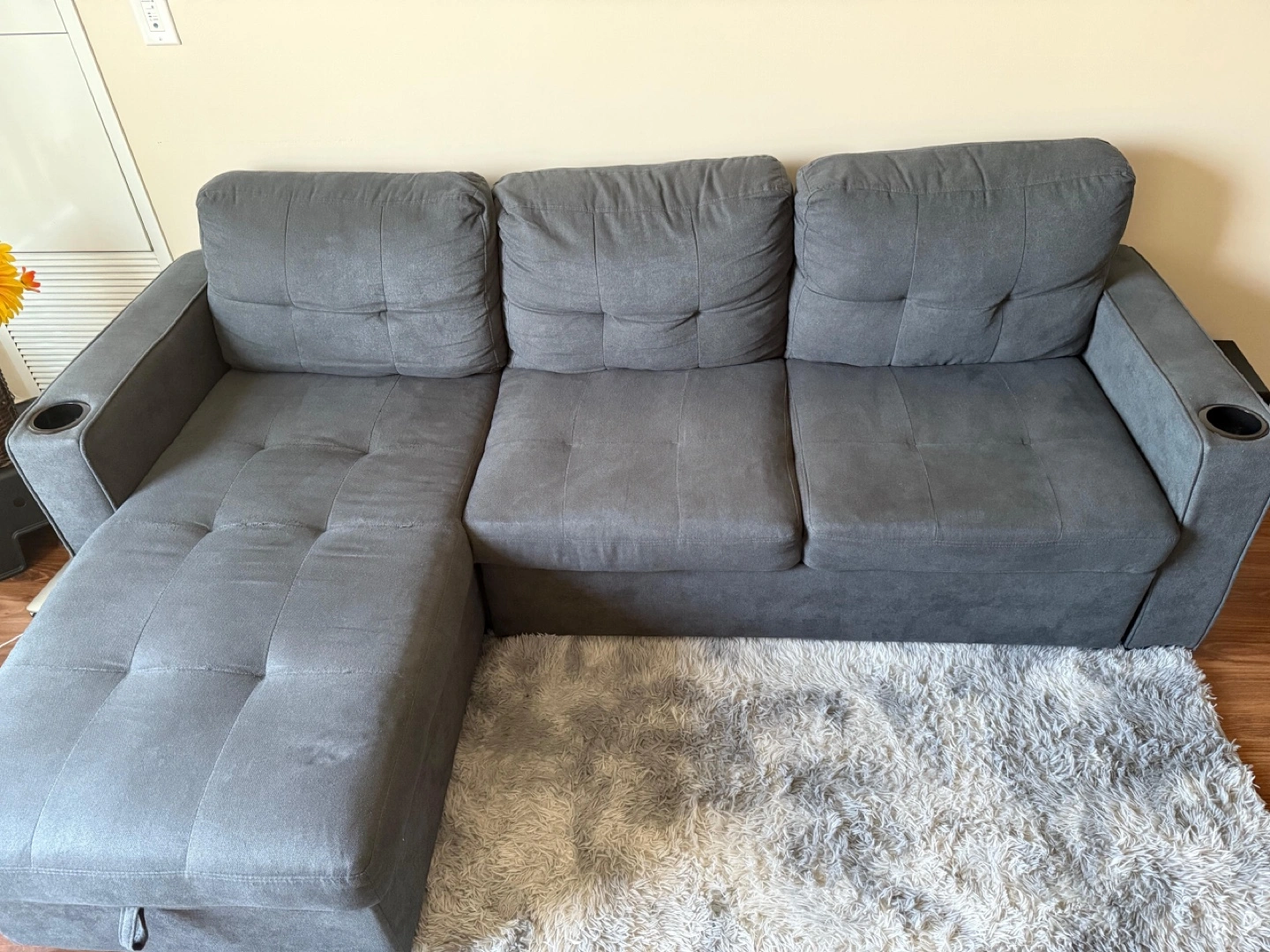 Looking to sell our grey sofa bed! It has a neat storage compartment, perfect for blankets or extra pillows. Used for a year. Coming from Pet/smoke free home. No stains.