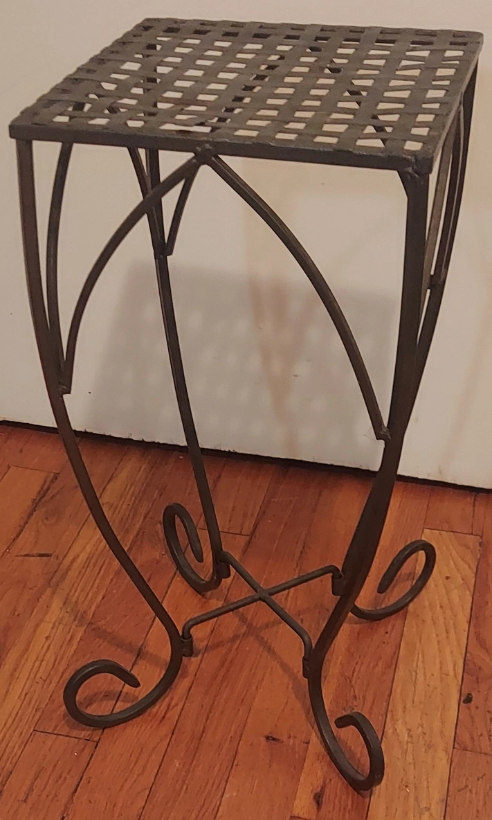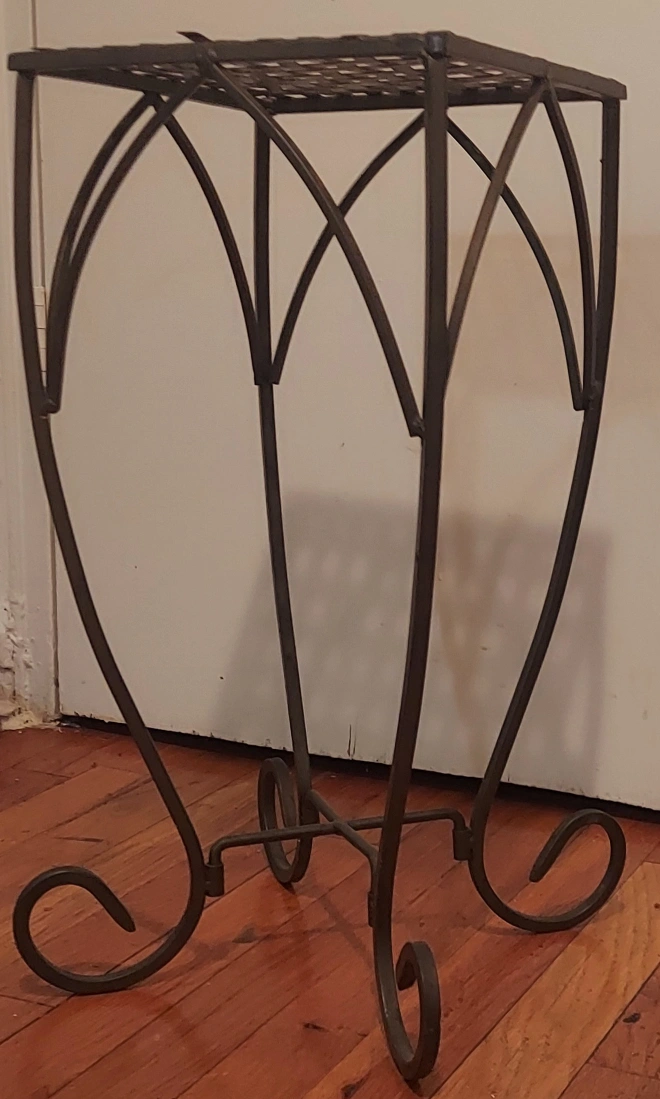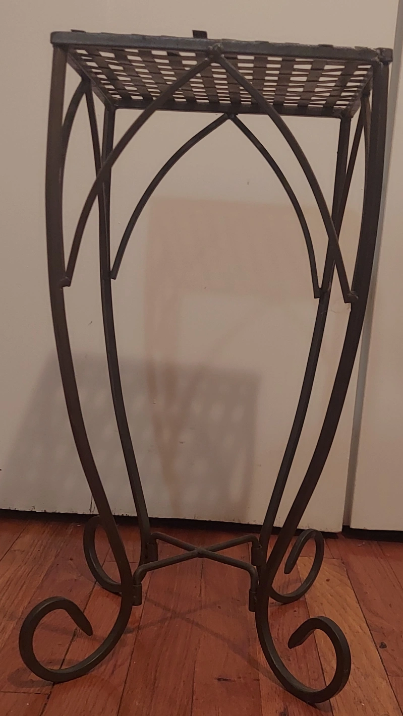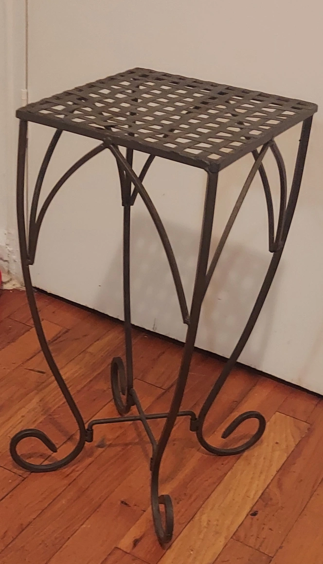 This is a lovely metal plant stand with a light pewter finish. It features a square lattice top and curved legs with decorative scrolls. Perfect for adding a touch of elegance to your indoor or outdoor space! #freecycle