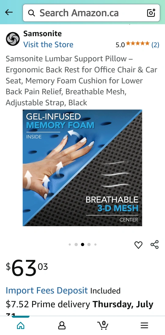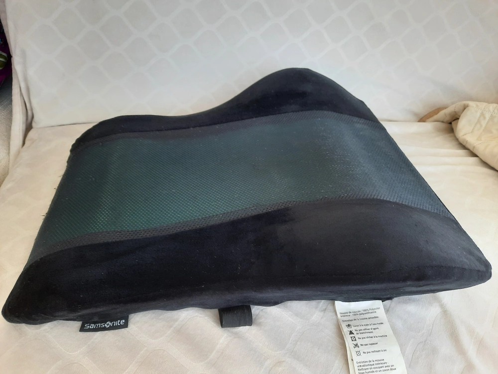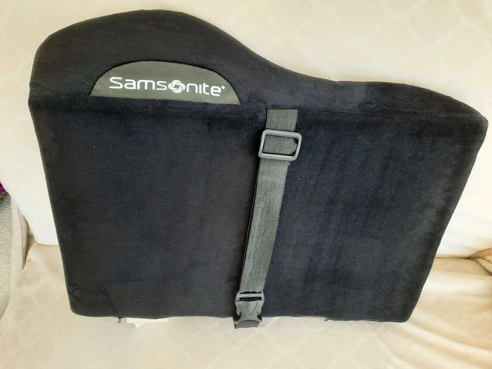 Looking to sell a Samsonite lumbar support pillow in black. It's an ergonomic back rest suitable for an office chair or car seat. It features breathable 3-D mesh and an adjustable strap for comfort. Originally bought for $63.03!