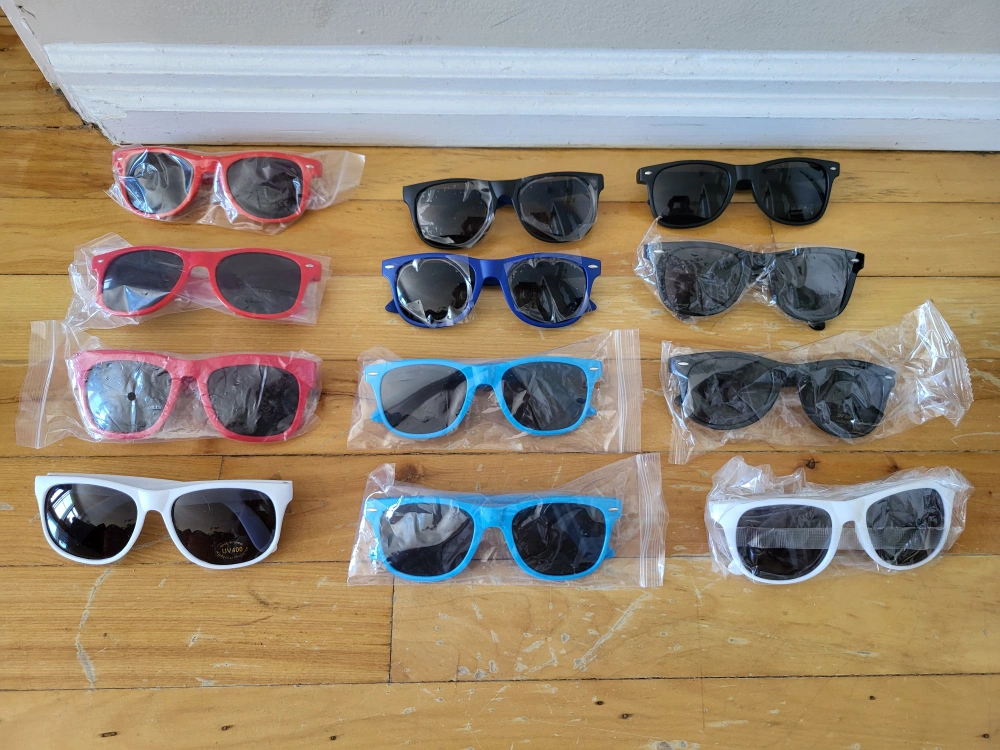 I have a bunch of brand new sunglasses for sale! They come in a variety of colours including red, black, blue, and white. They are still in their original packaging and they're perfect for keeping your eyes protected from the sun! -- Pick up Downtown West End Vancouver --