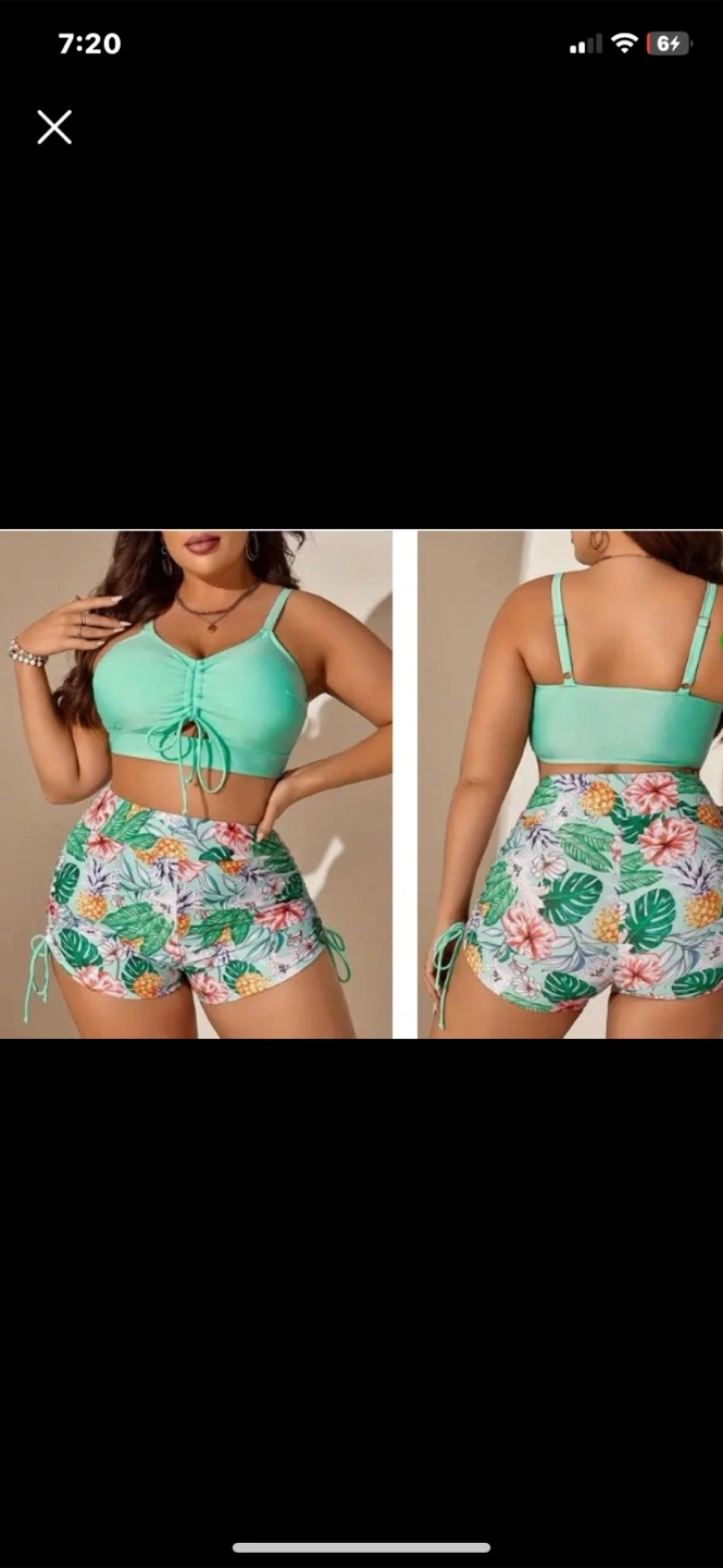 Cute two-piece swimsuit set! The top is a solid green color with adjustable straps and a drawstring detail. The shorts have a fun floral and pineapple print with drawstring sides. Perfect for the summer!