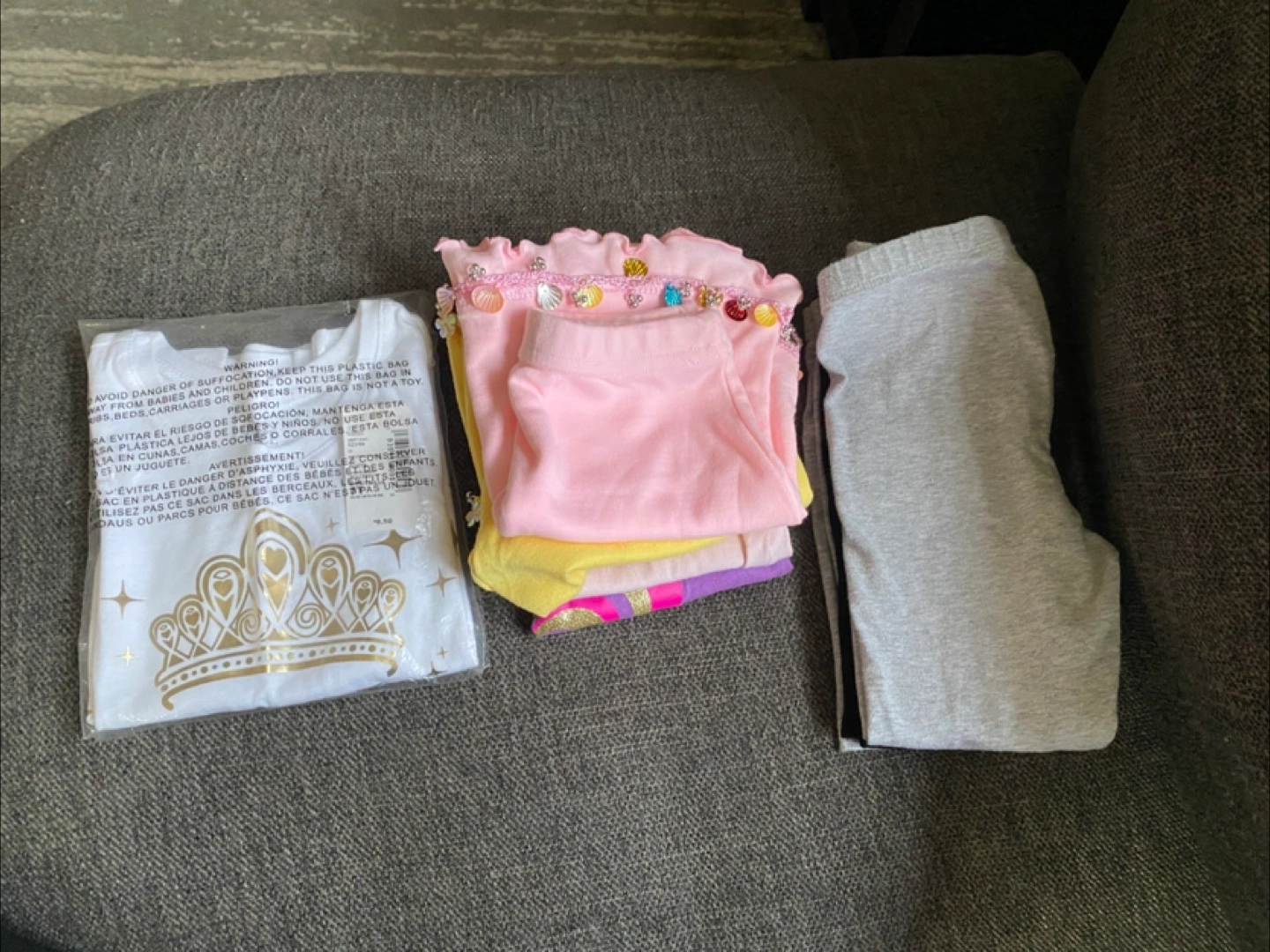Selling a bundle of baby girl clothes! Includes a white shirt with a gold crown birthday princess design brand new with tag, colorful skirts, and gray, black pants and shirt. Perfect for your little one!