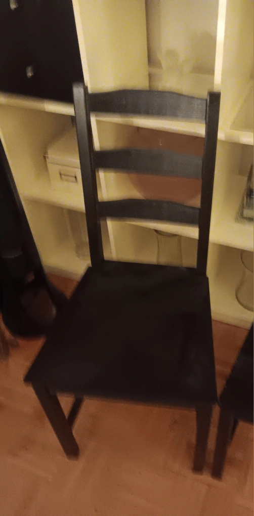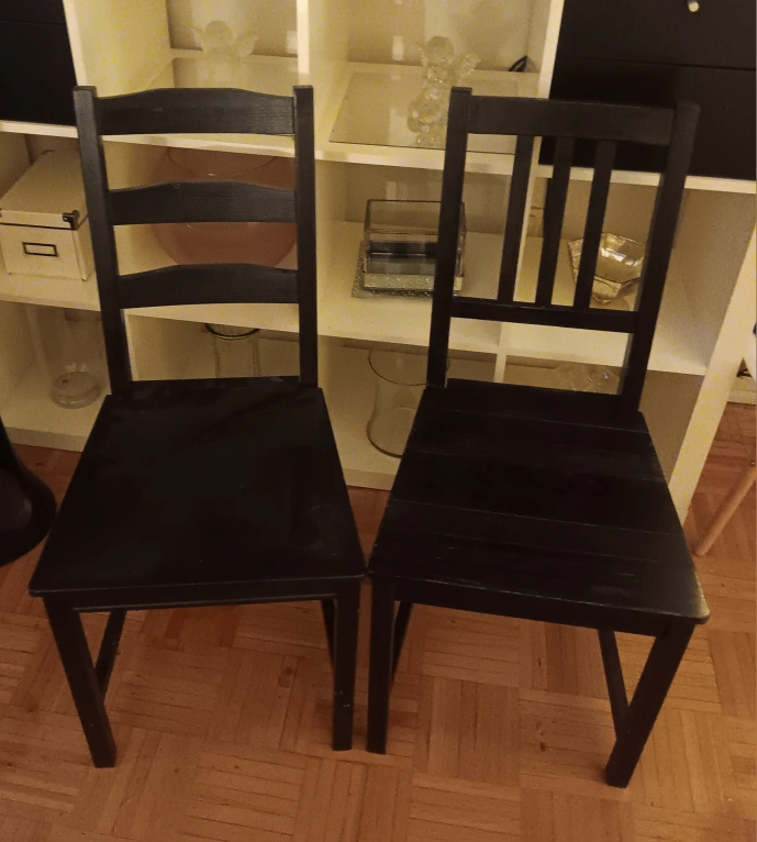 Selling a set of two black chairs, perfect for your dining room or kitchen! They're in good condition and ready for a new home. These chairs are sturdy and have a classic design that fits well with any decor