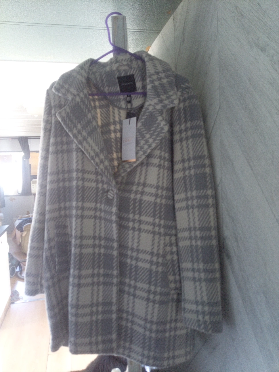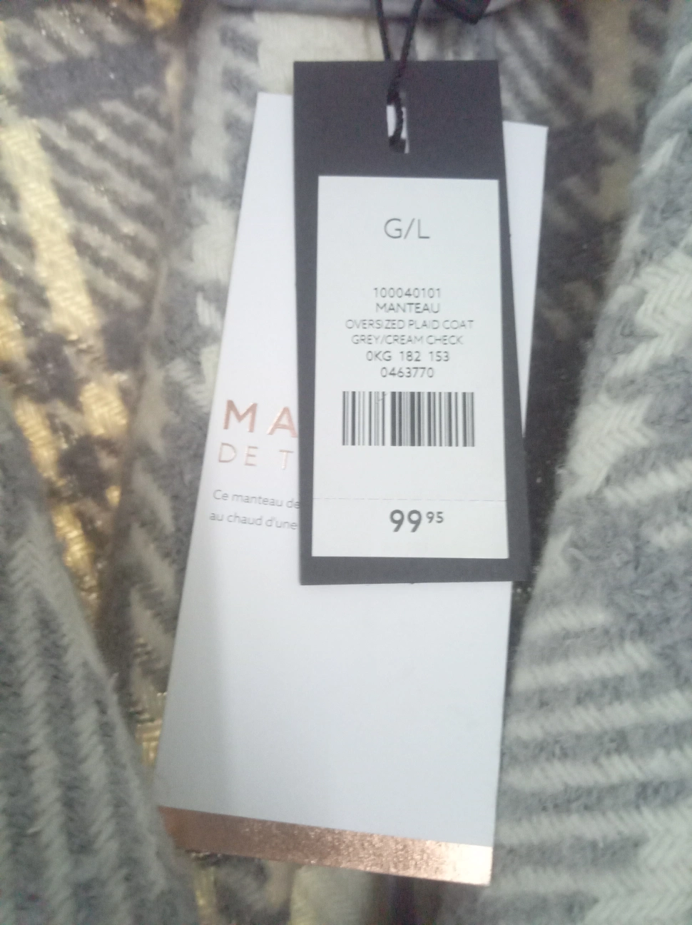 This coat is a Dynamite Brand. This is a oversize plaid coat grey/cream check, one button two good size pockets ( one on each side) women's coat size LARGE. it's never been worn still has all the store tags attached. there is a little minor thread pulling in the front near botton (the second and last picture) it's really not that noticeable ( I don't think). there is a price tag attached that has the selling price from a store at $99.00. also this coat was purchased a few years ago just been sitting in the closet.