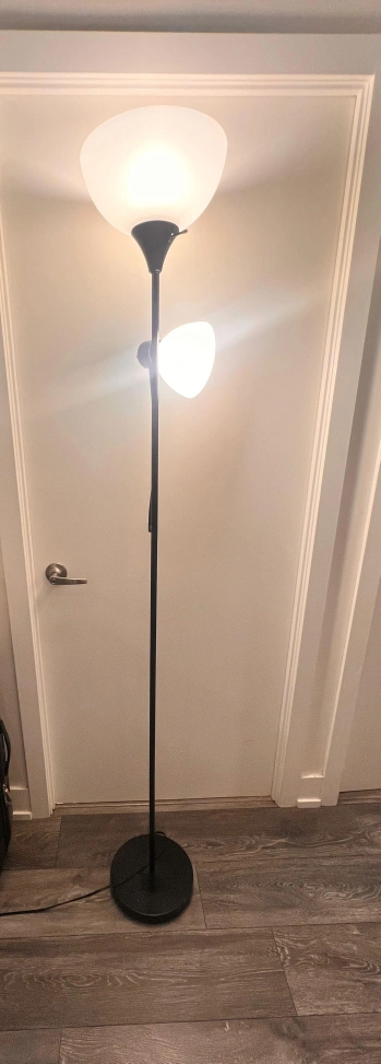 Selling a torchiere floor lamp with two lights. It has a sleek black finish and a modern design. Perfect for adding some extra light to any room!