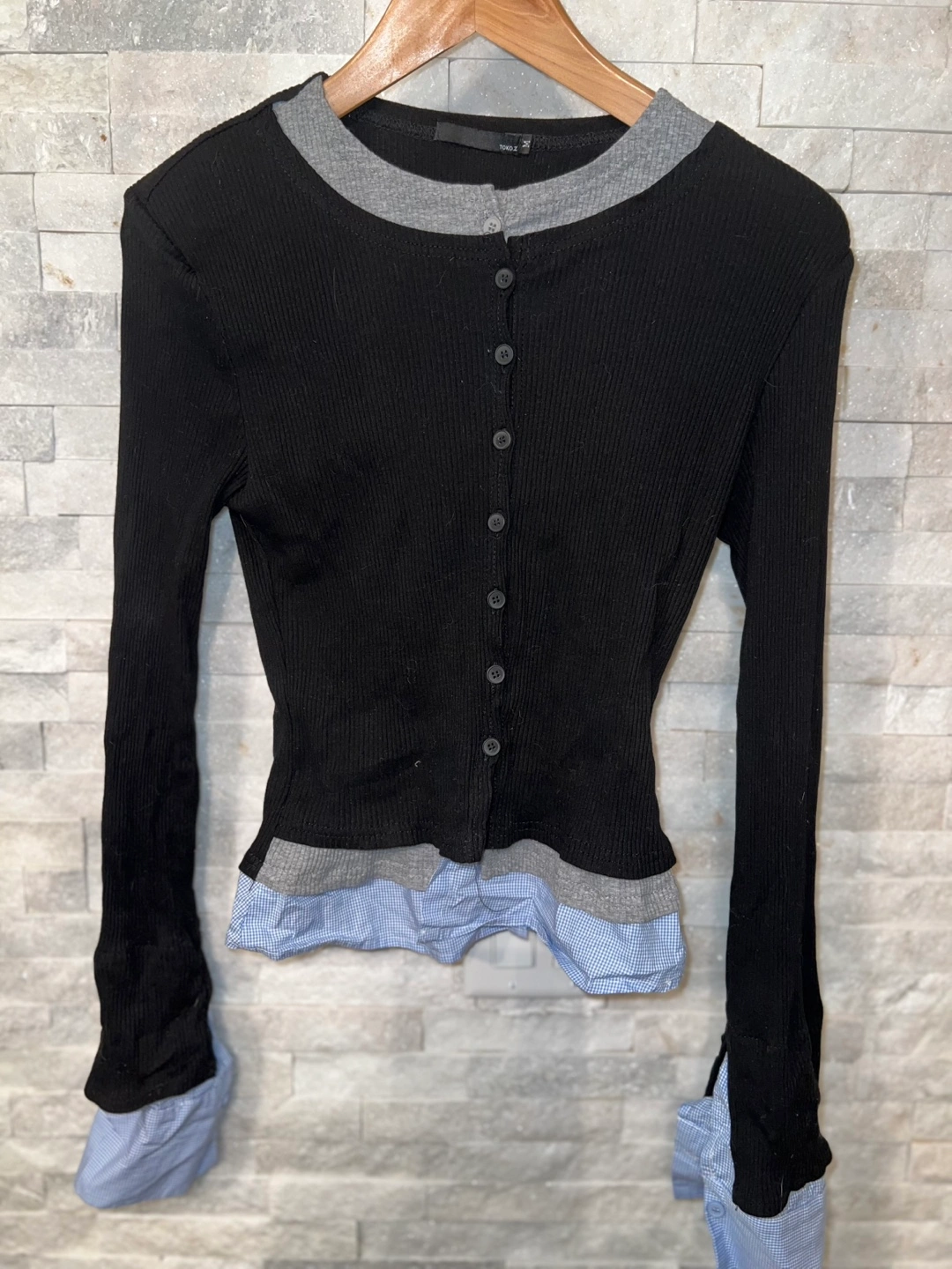 Here's a cute black cardigan from SONA in size small! It has a unique layered look with a blue and white striped shirt detail at the bottom and cuffs. A great addition to any wardrobe!