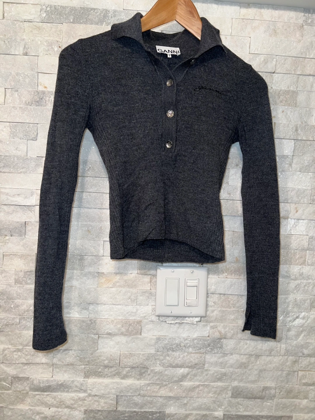 Selling a Ganni grey knit top in size small. It's in great condition and ready for a new home! The material is soft and comfortable, perfect for layering or wearing on its own.