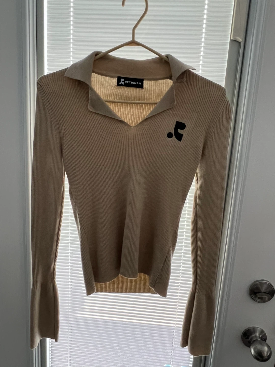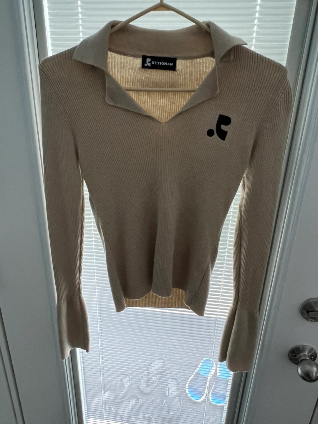 108A cute beige knit long sleeve top from RETIONAN! It features a collared V-neck and a unique sleeve design. It's in great condition and ready for a new home