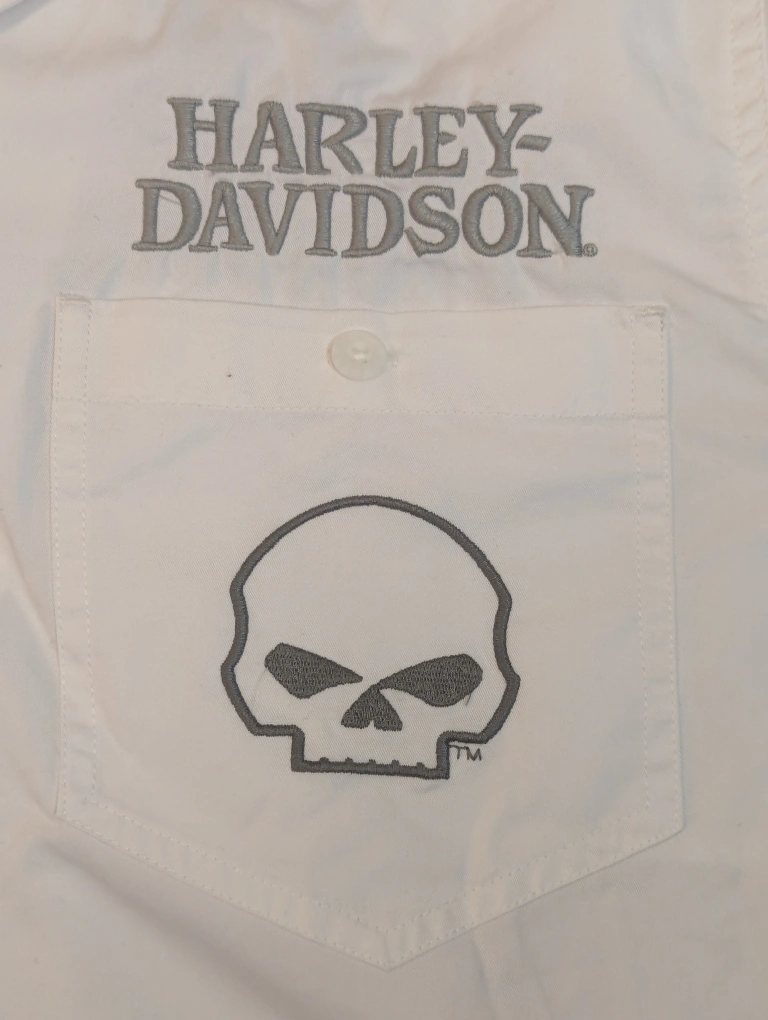 Authentic Harley-Davidson men's short sleeve button-up shirt in crisp white. Features bold embroidered Harley-Davidson branding on both the front chest pocket and across the back, including the iconic skull logo and winged “Motorcycles” design. Made from lightweight, breathable material—perfect for riding or casual wear. Size XL. In excellent pre-owned condition with no rips, stains, or flaws.