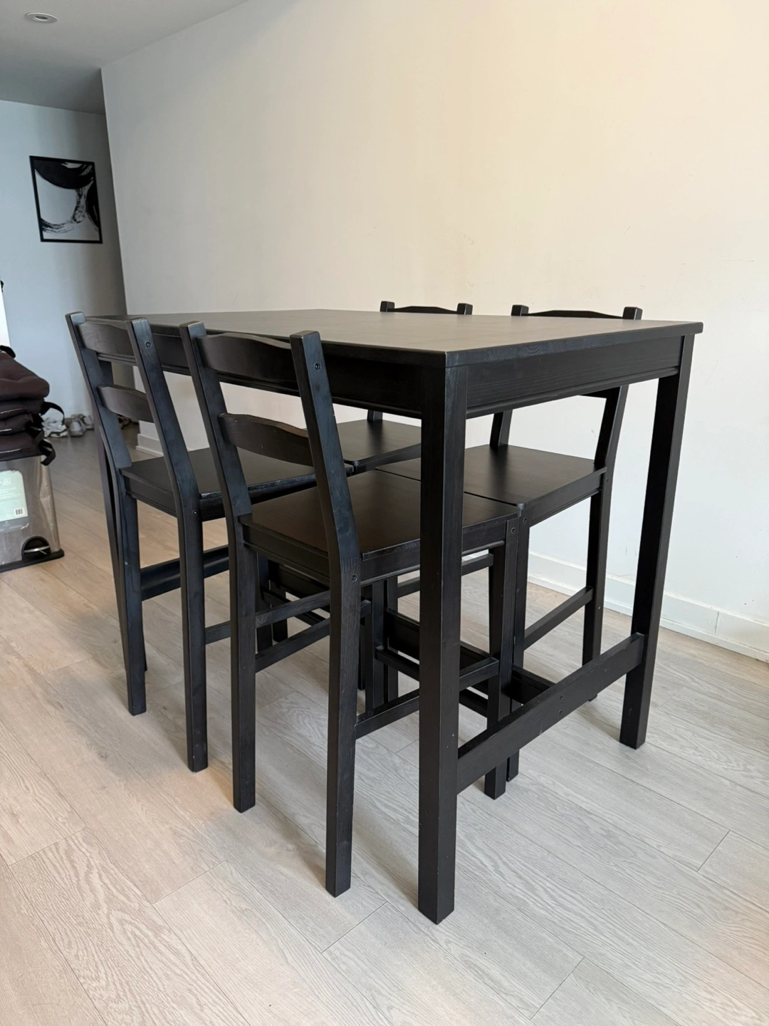 Selling a black counter height dining table with four matching chairs. It's a great set for smaller spaces or a breakfast nook! The table has a few minor scratches on the surface, but overall it's in good condition and very sturdy. Perfect for casual dining or entertaining friends