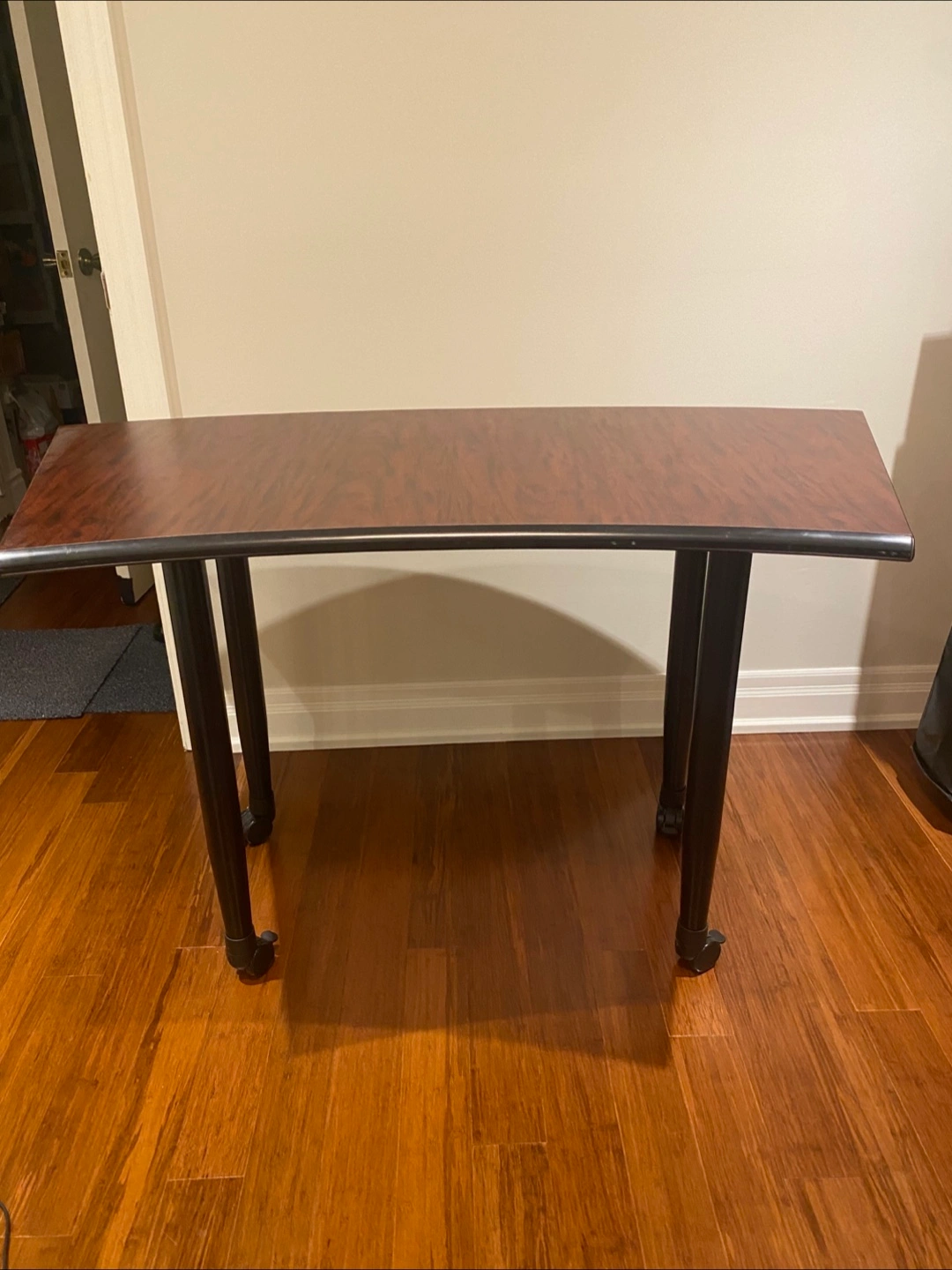 A wood grain desk that would be perfect for a home office or study space! It features a smooth, curved top and sturdy legs with lock rolling casters, making it easy to move around. The dark wood finish gives it a classic look that would complement any decor.