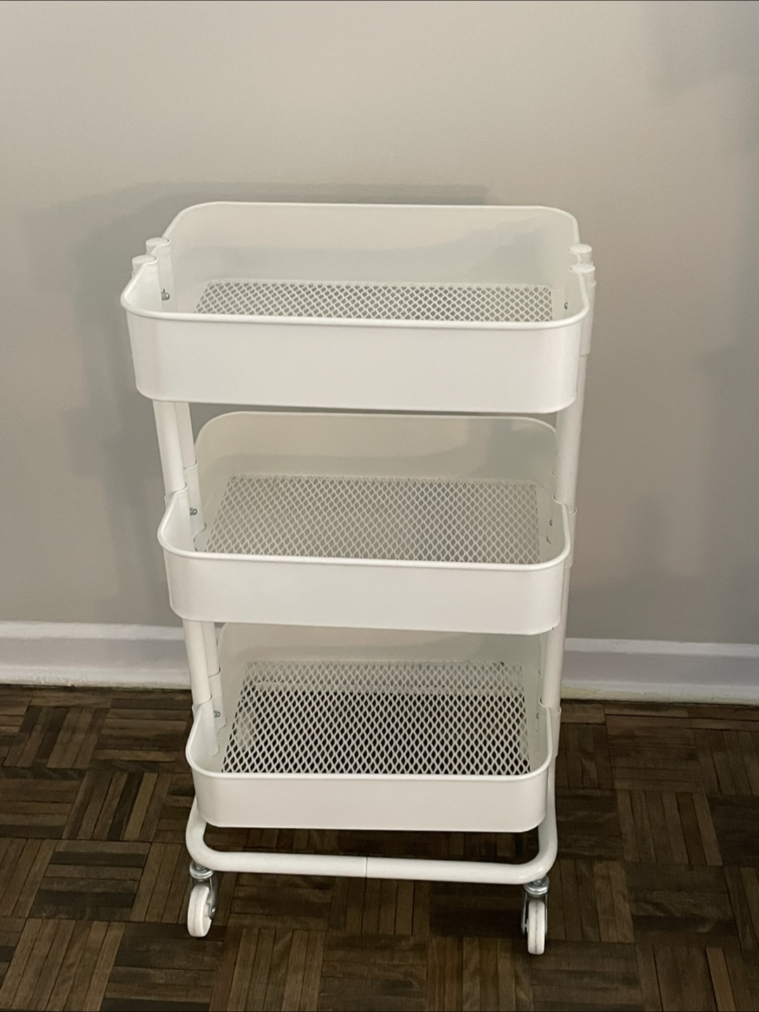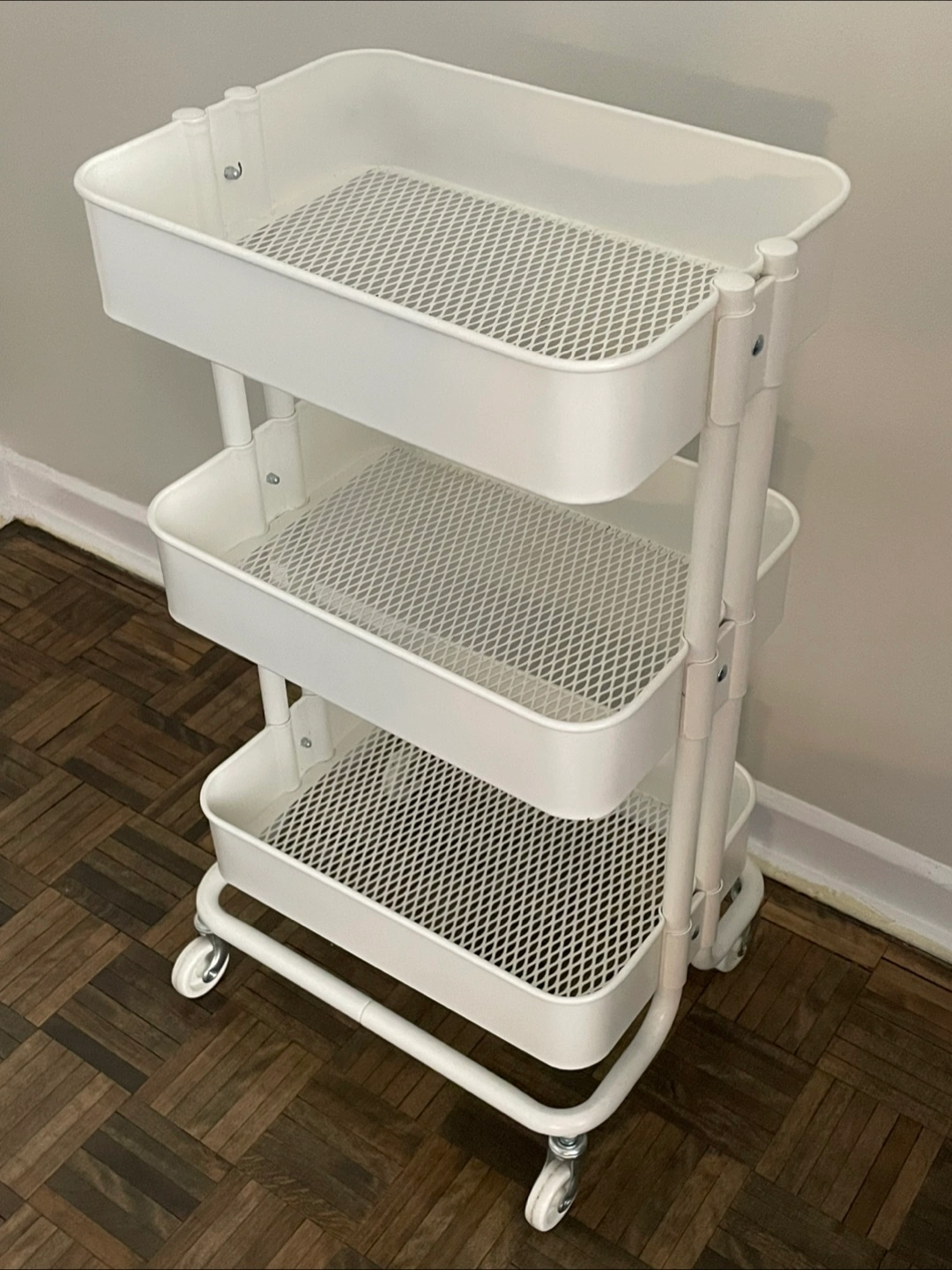 Looking to declutter? This IKEA RÅSHULT rolling cart is a great way to organize your space! It’s perfect for the kitchen, bathroom, or even a craft room. The white colour blends in with any decor, and the three tiers provide ample storage. It’s in great condition and ready for a new home!
