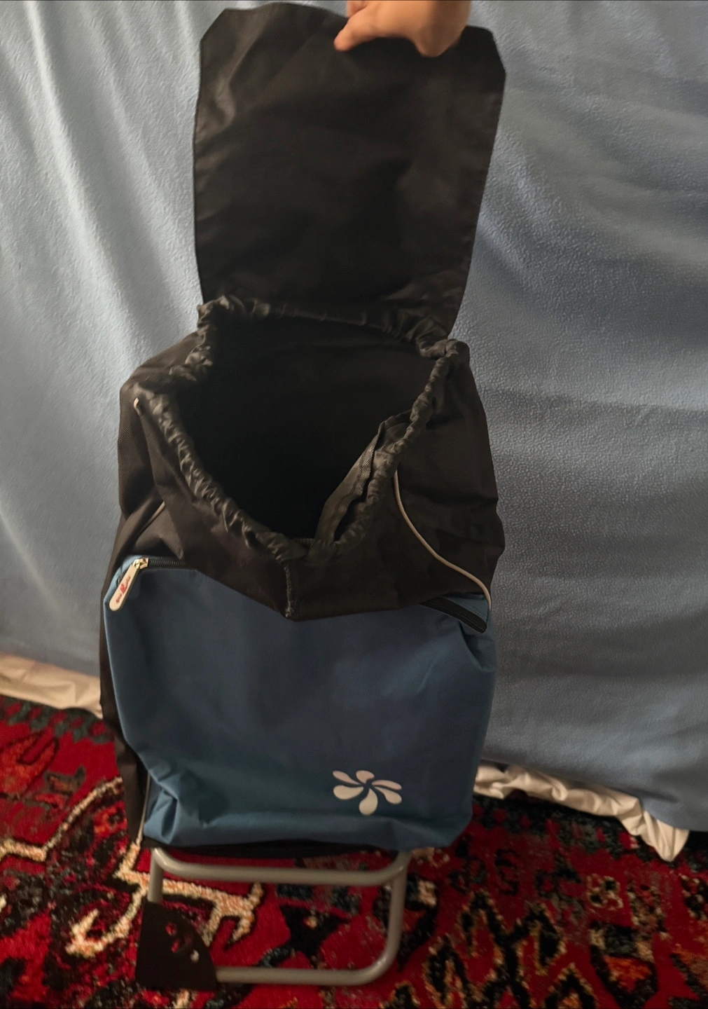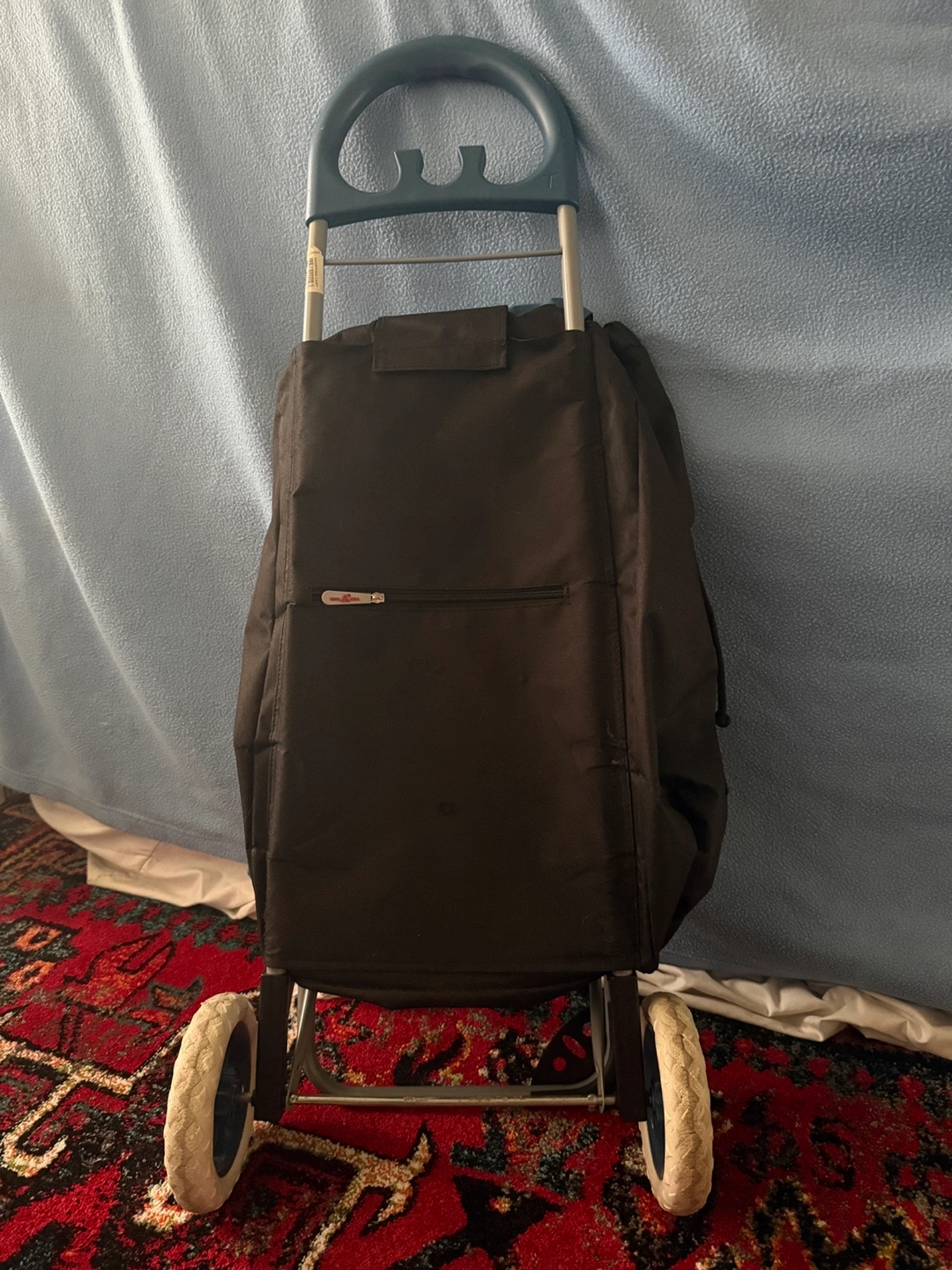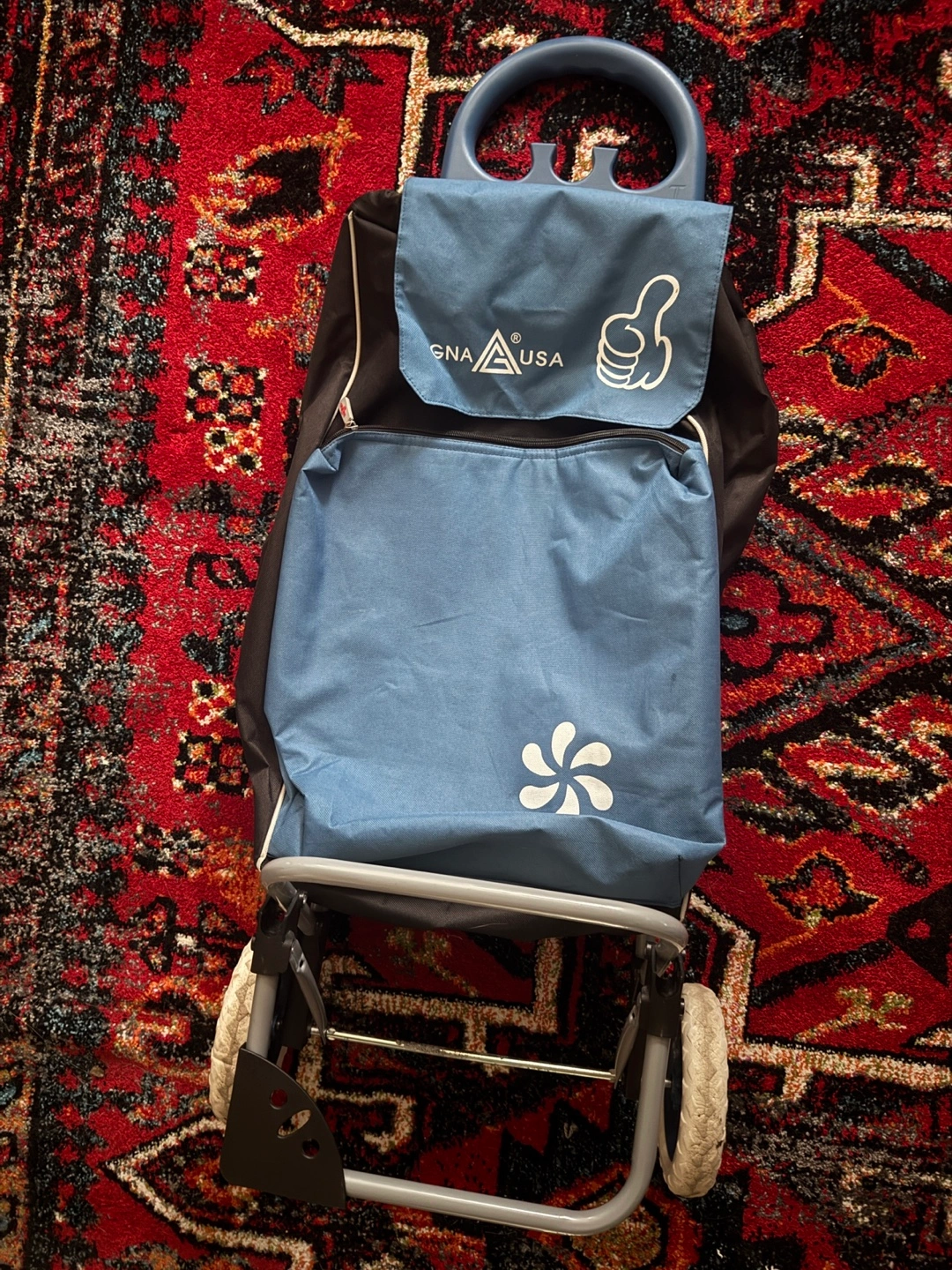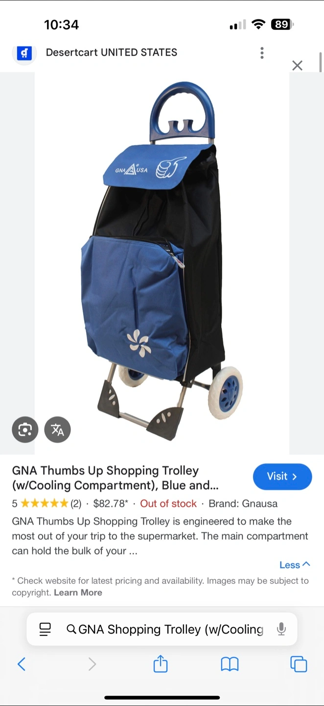 Selling a GNA Thumbs Up shopping trolley! It's blue and black and has a cooling compartment. Perfect for trips to the supermarket. It has a little hole in back but still in great working condition.