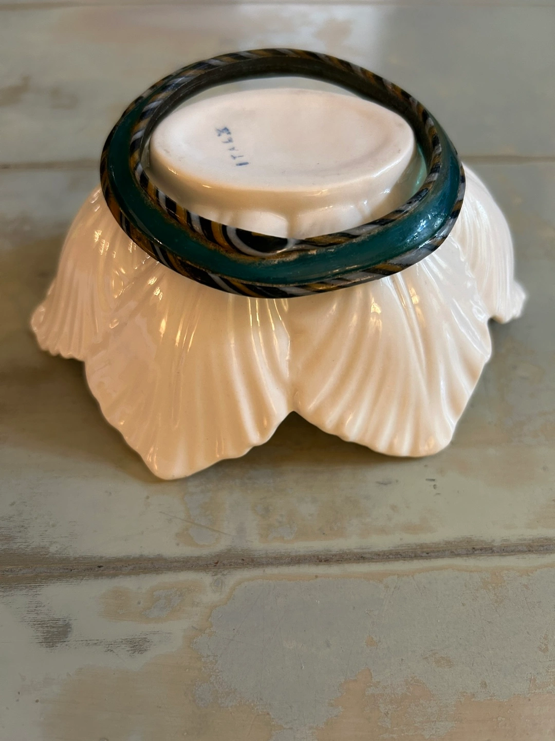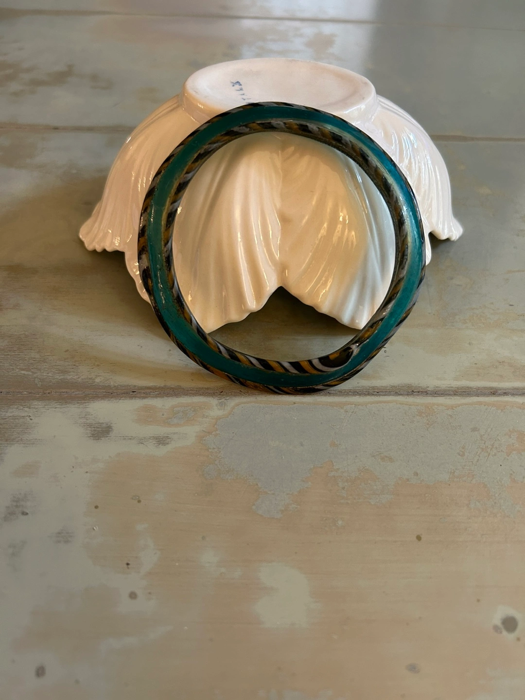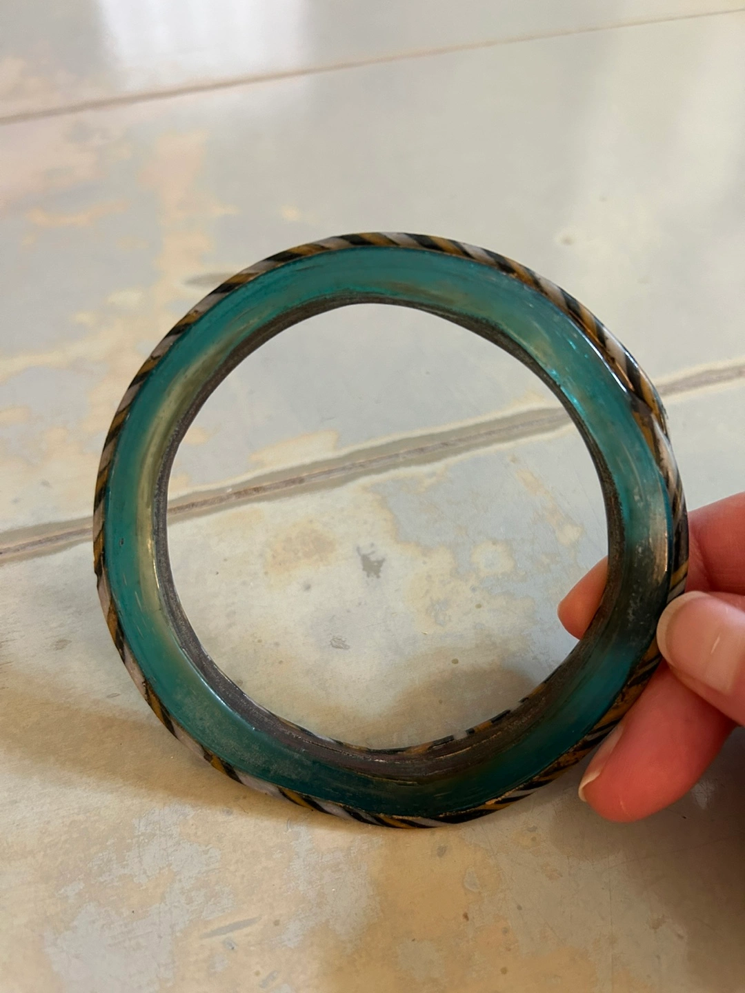 Rare Find Ancient Roman Glass Bracelet comprised vibrant turquoise coloured glass with bands of gold, white and black on the outer band. 31/2” in diameter.