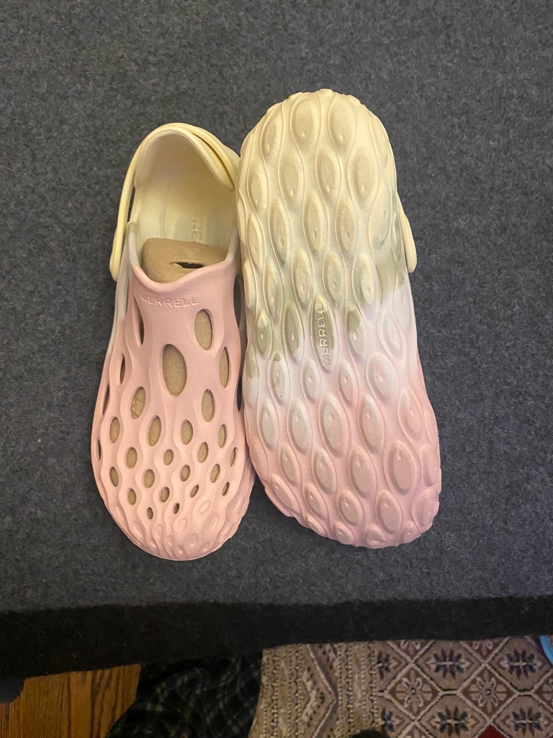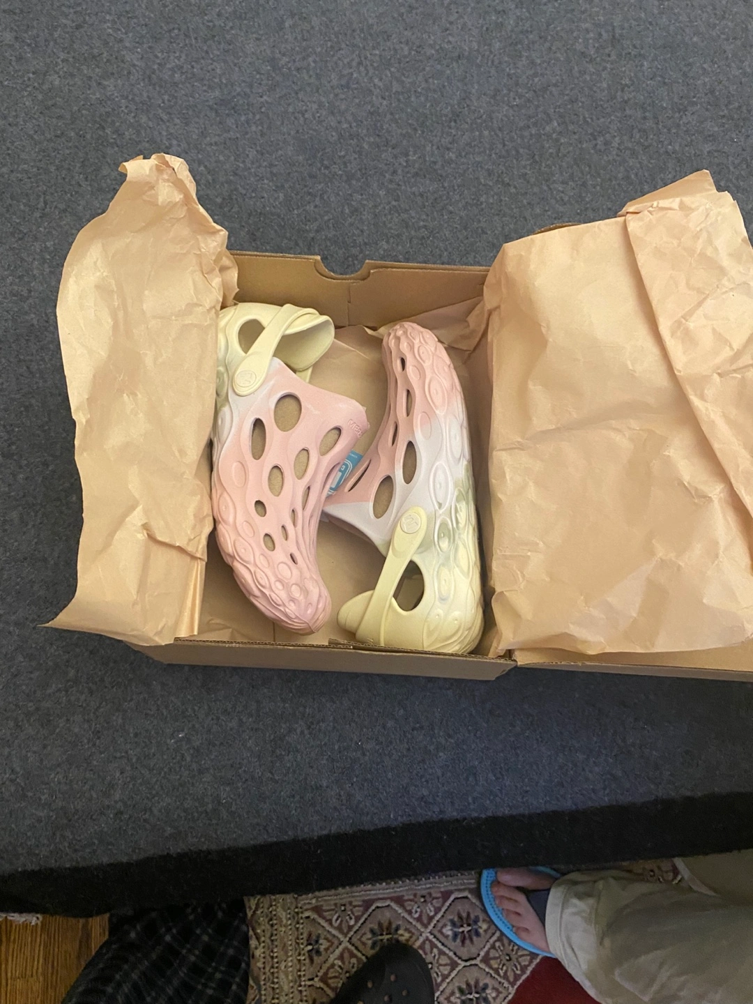 Bought these in size 7 but a tad too tight. They are brand new in the box. Yellow and pink tydye colour. In great condition. High quality.
